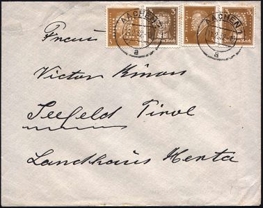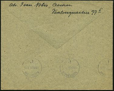 9522 | 25 € | 5100 AACHEN (Allgem. Abteilung, Tagesstempel, Ganzsachen etc.) : AACHEN 1/ a 1932 (11.2.) 2K-Steg 2x auf 2 verschiedenen 3 Pf. Goethe , braun + 2x 3 Pf. Ebert ,braun, nur v e r s c h i e d e n e Firmen-lochungen! (Bf. oben gr. Seitenriß) privater Abs., Ausl.-Bf. n.Tirol (= 12 Pf. Inl.-Porto) interess. u. kuriose Verwendung! (Mi.385/86, 2x 419 Perfin) | ![]() | |