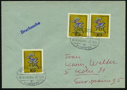 9526 | 14 € | 5100 AACHEN (Allgem. Abteilung, Tagesstempel, Ganzsachen etc.) : AACHEN-KÖLN/ BONN/ ÜBERLANDPOST/ 0510-03/ 13/ b/ FLUGHAFEN 1975 (26.5.) Oval-Steg = mobiles Postamt im Überland-Postomnibus 2x auf 3x 10 Pf.+ 5 Pf. Wofa (Zinnfigur Christkind) Inl.-Bf. n. Köln (Mi.610 MeF) | ![]() | |
