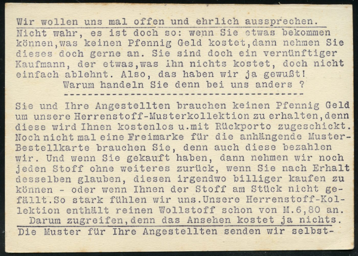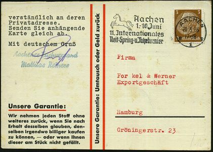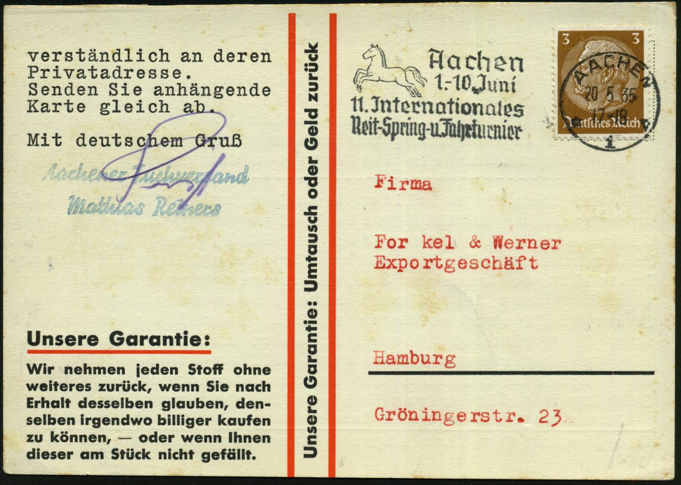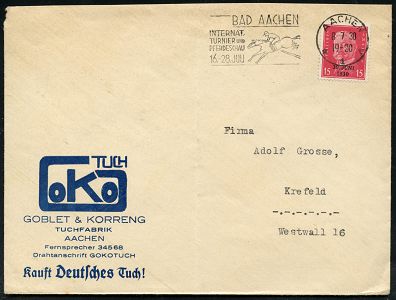 9556 | 25 € | 5100 AACHEN (Maschinen- und Serienstempel) : AACHEN/ *1v/ INTERNAT./ TURNIER U./ PFERDESCHAU 1930 (8.7.) MWSt (Springreiter) klar auf Firmen-Bf.: oko Tuch GOBLET & KORRENG, TUCHFABRIK.. "Kauft Deutsches Tuch!" = antisemitische Werbung! (Bf. schwache Mittelfalte) n. Krefeld (Bo.13 A) | ![]() | |