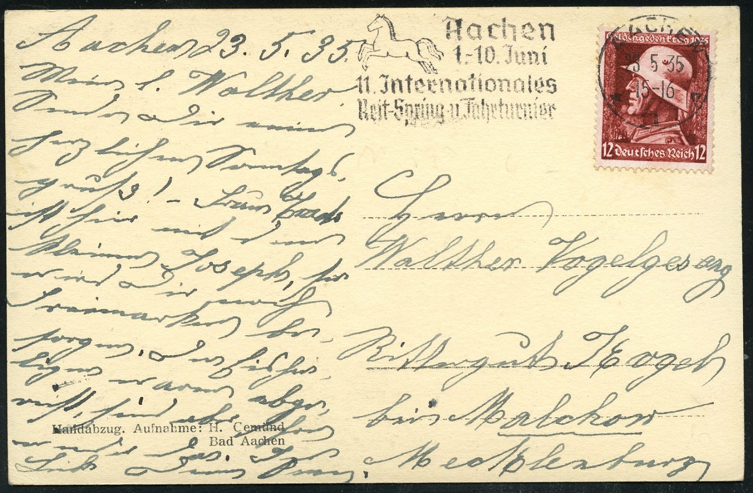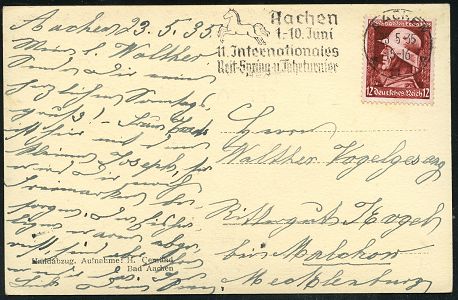 9557 | 18 € | 5100 AACHEN (Maschinen- und Serienstempel) : AACHEN/ *1v/ 1.-10.Juni/ 11.Jnternat./ Reit-Spring-u.Fahrturnier 1935 (20.5.) MWSt (Pferd) klar auf (halber) Firmen-Reklame-Kt.: Aachener Tuchversand, Mathias Reiners (Bo.17 A) | ![]() ![]() | |