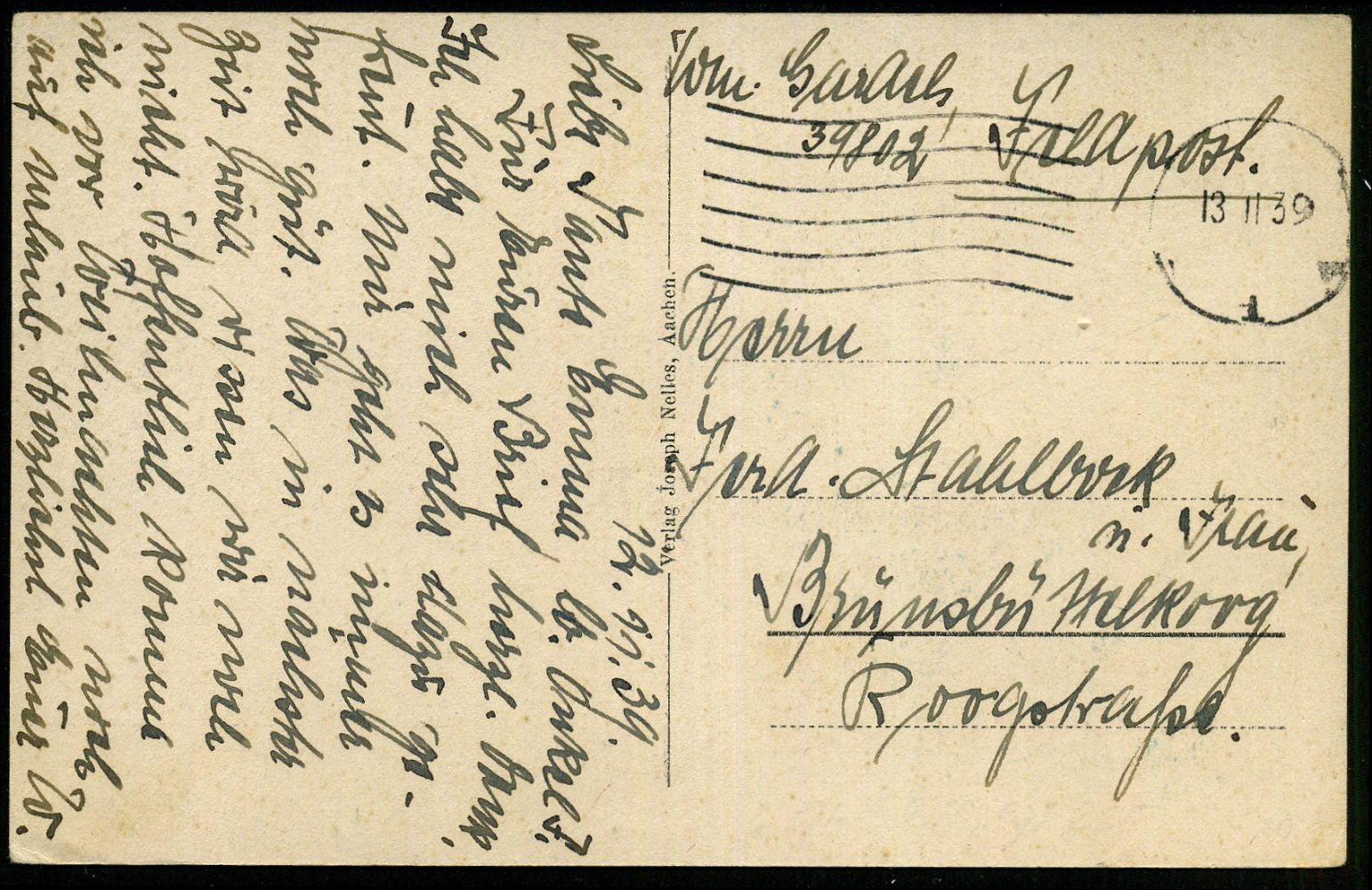 9560 | 18 € | 5100 AACHEN (Maschinen- und Serienstempel) : Aachen 1939 (13.11.) stummer MaWellenSt = Tarnstempel Aachen auf s/w.-Foto-Ak.: Hauptpostgebäude, Feldpost-Kt. n. Brunsbüttelkoog | ![]() ![]() | |