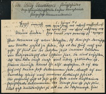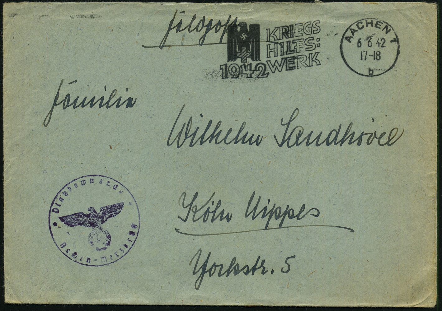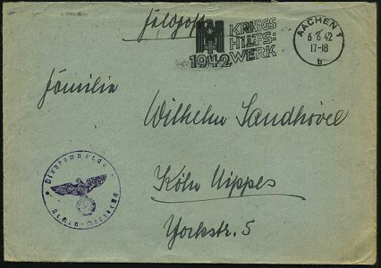 9562 | 18 € | 5100 AACHEN (Maschinen- und Serienstempel) : AACHEN 1/ b/ KRIEGS-/ HILFS-/ WERK 1942 (6.6.) Serien-MWSt = Rotkreuz-Logo + blauer 1K-HdN: Platzkommando/Aachen-Merzbrink = Fliegerhorst , Feldpost-Bf. (oben kl. Öffnungsmäng.) + Inhalt n. Köln (Bo.S 391 A , nur 3 1/2 Monate verwendet) | ![]() ![]() | |
