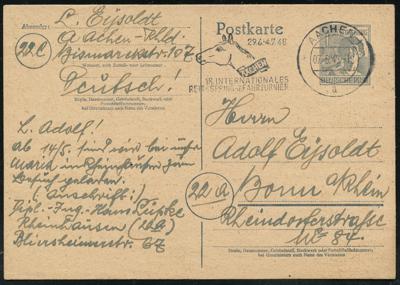9563 | 16 € | 5100 AACHEN (Maschinen- und Serienstempel) : AACHEN 1/ a/ 18.INTERNAT./ REIT-,SPRING-u.FAHRTURNIER 1948 (7.6.) MWSt (Pferdekopf) klar gest. Inl.-Bedarfs-Kt. mit viel Text n. Bonn (Bo.26 A) | ![]() | |