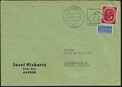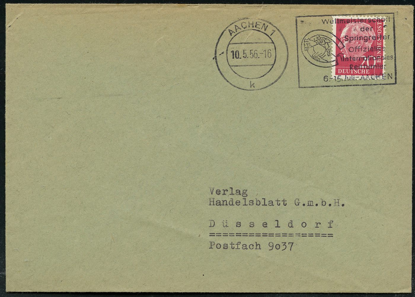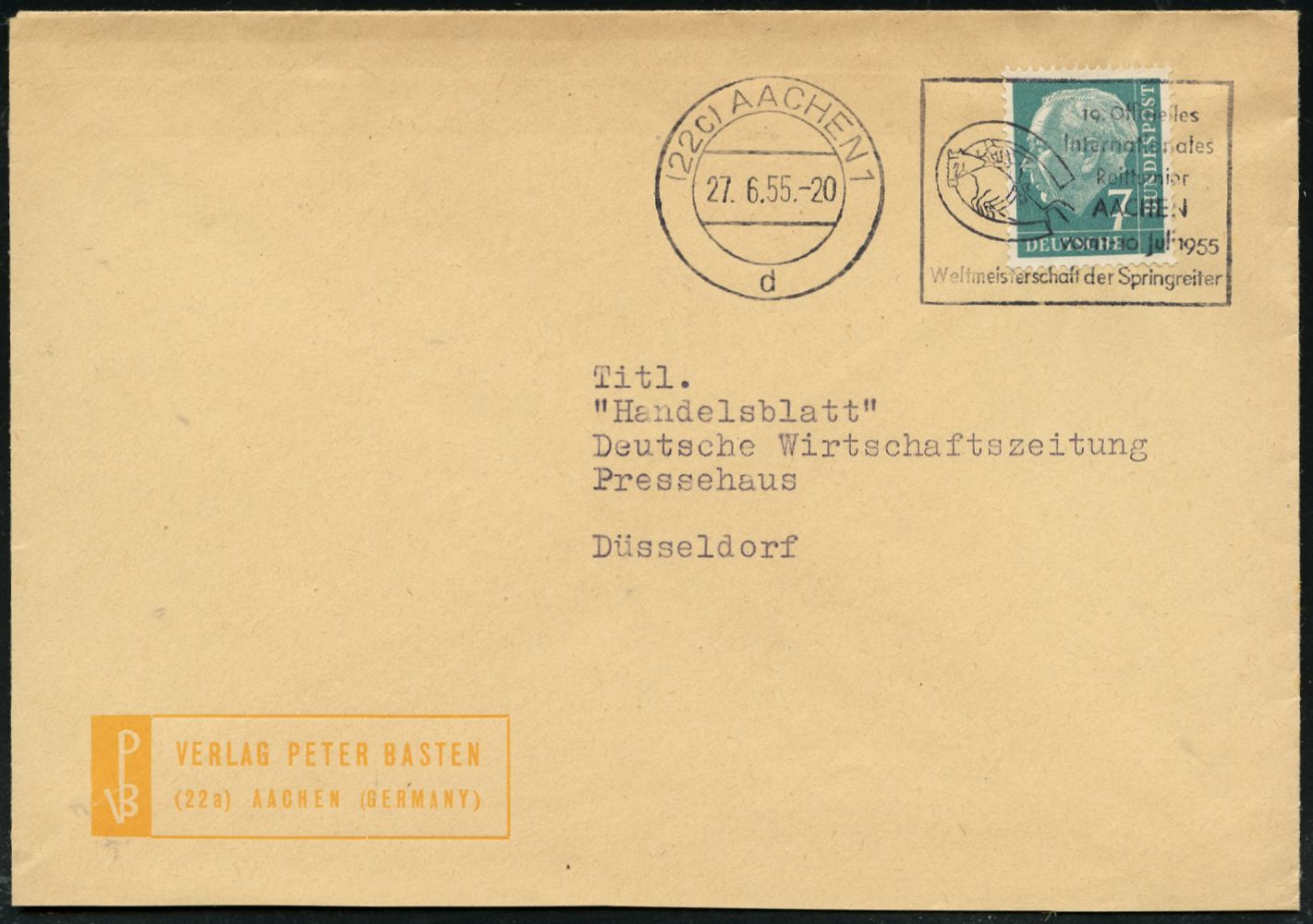 9567 | 18 € | 5100 AACHEN (Maschinen- und Serienstempel) : AACHEN 1/ k/ 18.Offiz./ Internat./ Reitturnier/ ..DRESSUR-WELT-CHAMPIONAT 1954 (5.6.) MWSt (Pferdekopf) klar gest. Firmenbf.: Josef Hickertz KG.. (Bo.40 B) | ![]() | |