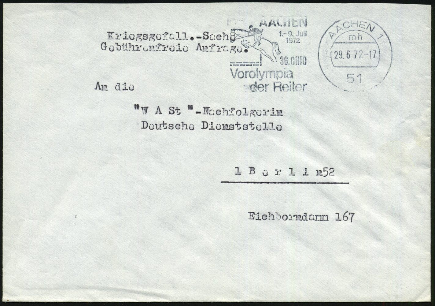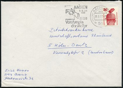 9571 | 12 € | 5100 AACHEN (Maschinen- und Serienstempel) : 51 AACHEN 1/ mn/ ..1.-9.Juli/ 1972/ 36.CHIO/ Vorolympia/ der Reiter 1972 (29.5.) MWSt (Springreiter) klar auf Bedarfs-Bf. (Bo.83 A X) | ![]() | |