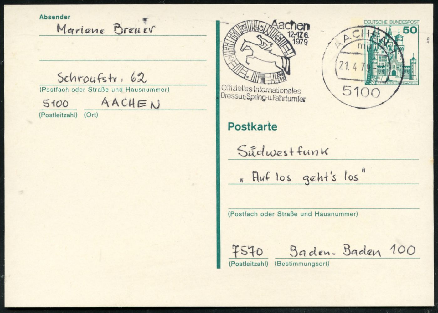 9573 | 8 € | 5100 AACHEN (Maschinen- und Serienstempel) : 5100 AACHEN 1/ mp/ 12.-17.6./ Offiz.Int./ Dressur-,Spring-u.Fahrturnier 1979 (Apr.) MWSt (Flaggen, SpringrReiter) Bedarfs-Kt. | ![]() | |