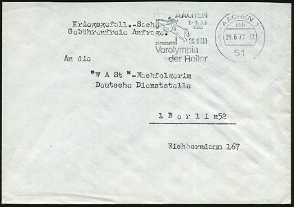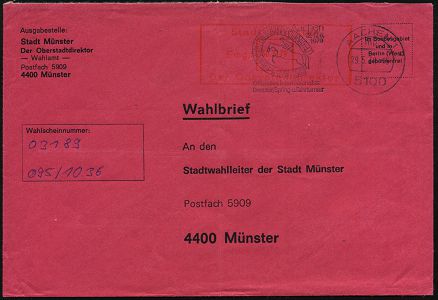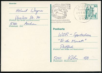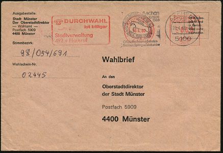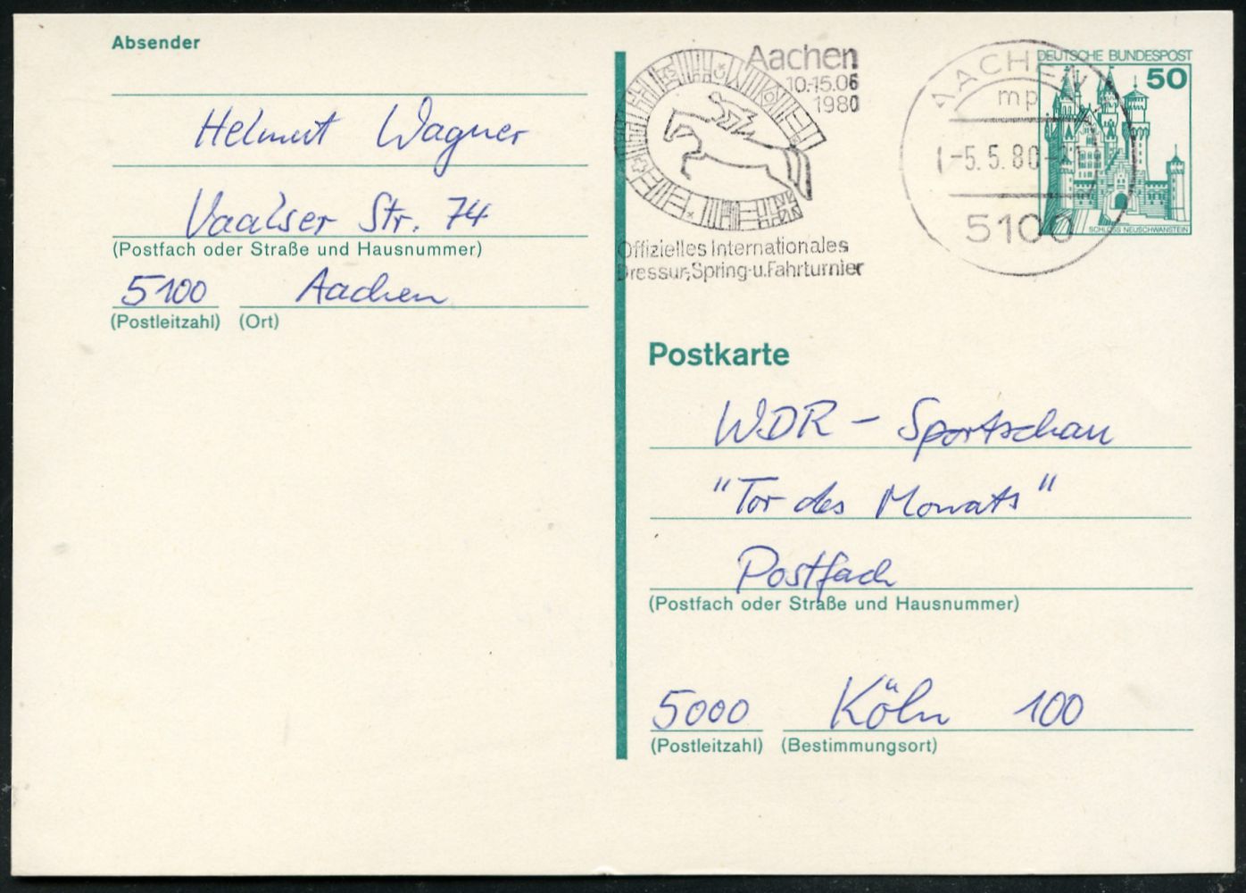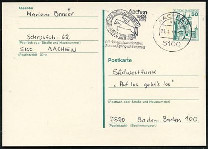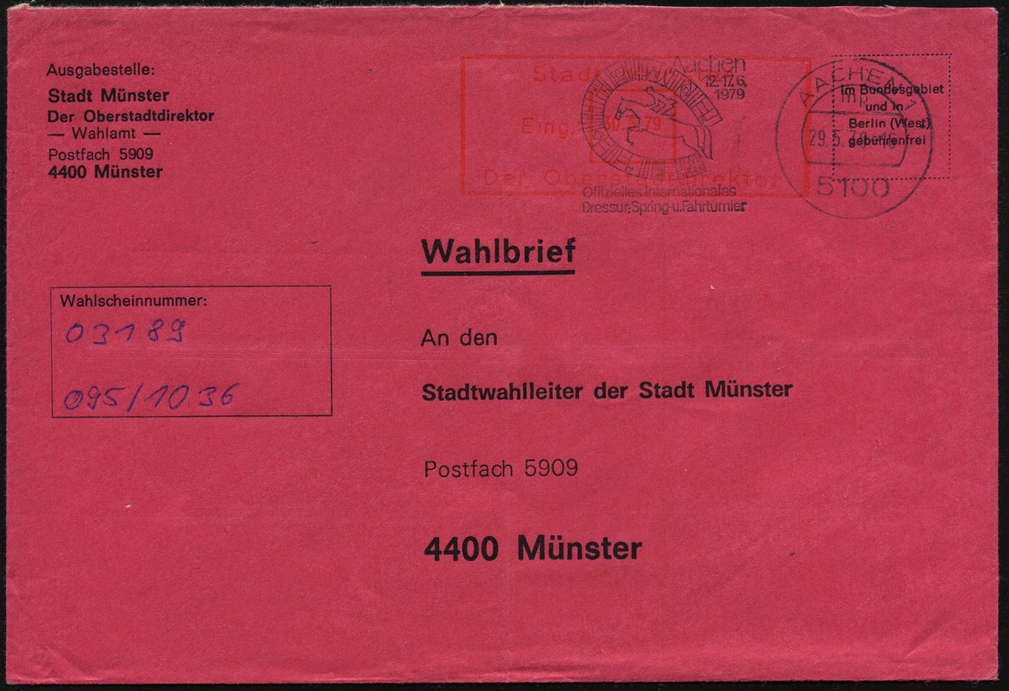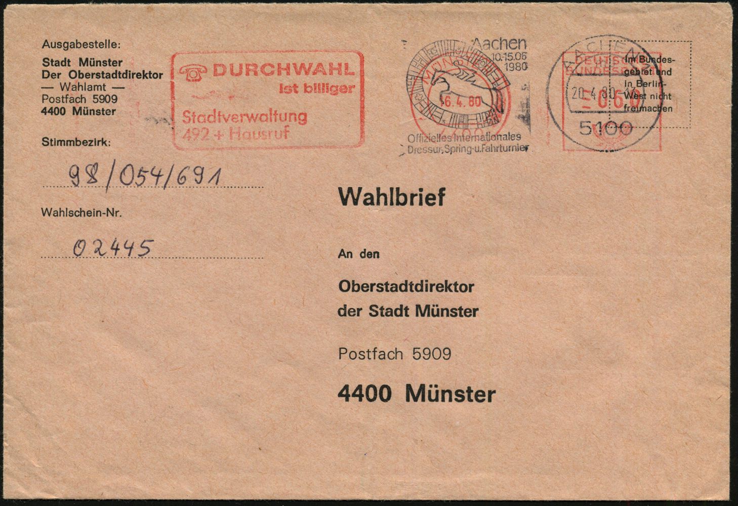9577 | 15 € | 5100 AACHEN (Maschinen- und Serienstempel) : 5100 AACHEN 1/ mb/ 10.-15.6./ 1980/ Offit.Internat./ Dressur-,Spring-u.Fahrturnier 1980 (20.4.) MWSt = Springreiter (u. Flaggen) + AFS 4400 MÜNSTER/ ..Stadtverwaltung = vorausfrankierter "Wahlbrief"(Antwort-Bf.), seltene Verwendung! | ![]() ![]() | |