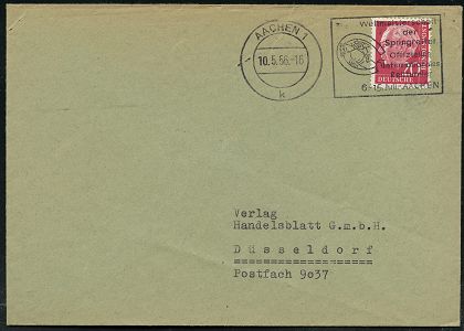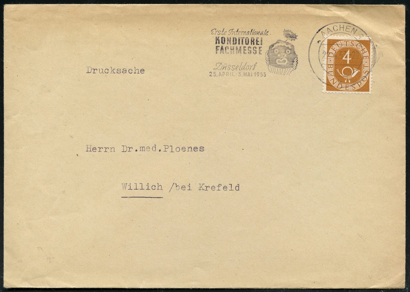 9565 | 18 € | 5100 AACHEN (Maschinen- und Serienstempel) : AACHEN 1/ k/ Erste Jnternationale/ KONDITOREI/ FACHMESSE/ Düsseldorf.. 1953 (22.4.) Serien-MWSt (Schokotörtchen) klar auf Bedarfs-Bf. (Do.S 631 A, nur 2 Monate in 7 Orten verwendet) | ![]() ![]() | |