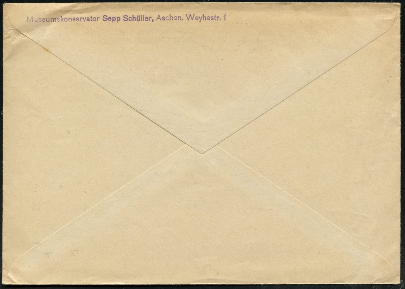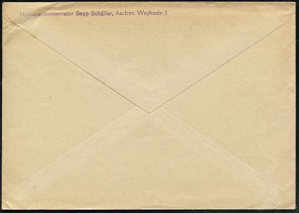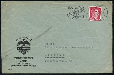 9561 | 16 € | 5100 AACHEN (Maschinen- und Serienstempel) : AACHEN 1/ e/ Benutzt/ die/ Luftpost! 1942 (30.1.) Serien-MWSt (Junkers Ju G-24) auf Dienst-Bf.: Reichsnährstand Blut u. Boden, Kreisbauernschaft (kl. Rißchen, rs. Klappenriß) Fernbf. (Bo.S 71 A) | ![]() | |