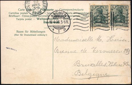 9553 | 20 € | 5100 AACHEN (Maschinen- und Serienstempel) : AACHEN/ *1p 1906 (19.4.) Maschinen-WellenSt. Typ Bickerdike = 3 x 6 Wellen + 2 x 2 Striche vertikal auf 2x 5 Pf. Germania, Ausl.-Color-Ak. (Dom) n. Brüssel (Miller.71) | ![]() ![]() | |