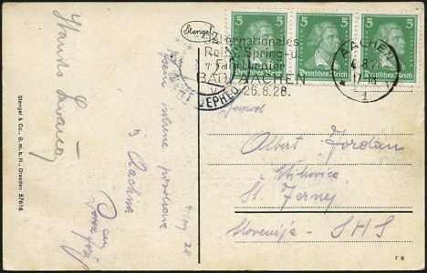 9554 | 20 € | 5100 AACHEN (Maschinen- und Serienstempel) : AACHEN/ *1v/ Jnternat./ Reit-,Spring-u./ Fahrturnier/ v.18.-26.8. 1928 (4.8.) MWSt , klar gest. Ausl.-Foto-Ak. (Theater etc.) n. Slowenien SHS, seltene Destination! (Bo.10 A) | ![]() ![]() | |
