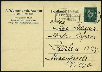 9555 | 18 € | 5100 AACHEN (Maschinen- und Serienstempel) : AACHEN/ *1v/ Aachen heilt/ Rheuma,Gicht,Ischias/ Nervenleiden 1929 (1.3.) MWSt auf Firmen-Kt.: A.Woltschonok Zigarettenfabrik (Bo.9 A , nur 1928-29 verwendet!) | ![]() | |