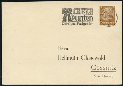 9559 | 18 € | 5100 AACHEN (Maschinen- und Serienstempel) : AACHEN 1/ b/ Aachener/ Printen/ Würziges Festgebäck 1937 (1.12.) MWSt (Kerze vor Christbaum) klar gest. Inl.-Kt., (Bo.18 A II, nur wenige Wochen 1937 verwendet !) | ![]() | |