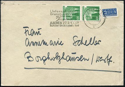 9564 | 20 € | 5100 AACHEN (Maschinen- und Serienstempel) : AACHEN 1/ a/ I.Internat./ Grenzlandtreffen/ der Schaffenden/ Jugend/ ..Deutscher Gewerkschafts Bund 1949 (29.3.) seltener MWSt auf Bauten-Frankatur , klar gest. Bedarfs-Bf. (Bo.27 A , nur sehr kurze Verwendungszeit!) | ![]() | |