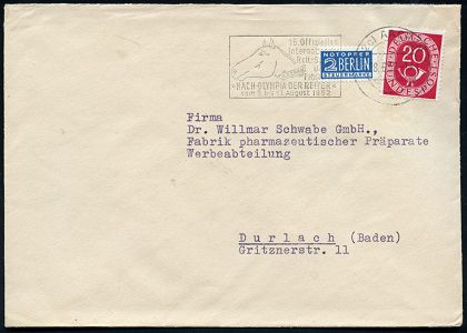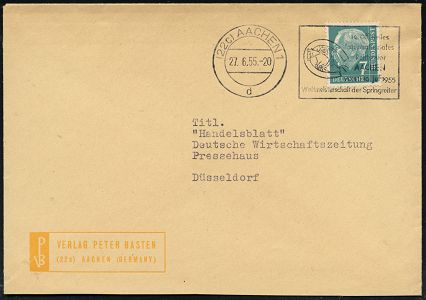 9566 | 25 € | 5100 AACHEN (Maschinen- und Serienstempel) : (22c) AACHEN 1/ 16.Offizielles/ Internat./ Reit-/ Spring-/ u./ Fahrturnier/ NACH OLYMPIA DER REITER.. 1952 (18.6.) MWSt. = Pferdekopf klar auf Firmen-Bf., rs. Abs.: KREFELDER ADRESSBUCH:: (Bo.38 A) | ![]() | |
