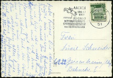 9570 | 14 € | 5100 AACHEN (Maschinen- und Serienstempel) : 51 AACHEN 1/ md/ 33.CHIO/ INT./ SPRINGCHAMPIONAT/ V.DEUTSCHLAND 1969 (10.5.) MWSt = Spingreiter , klar gest. s/w.-Foto-Ak.: Bad Aachen, Burtscheid (10 Detailansichten) Bedarf (Bo.72 A Type I = UB "md") | ![]() ![]() | |