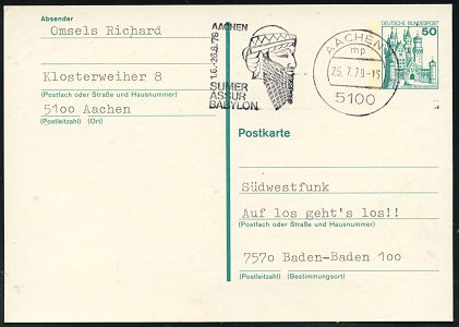 9574 | 8 € | 5100 AACHEN (Maschinen- und Serienstempel) : 5100 AACHEN 1/ mp/ SUMER/ ASSUR/ BABYLON 1979 (25.7.) MWSt (Assyrer mit geflochtenem Bart) Bedarfs-Kt. | ![]() | |