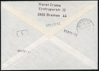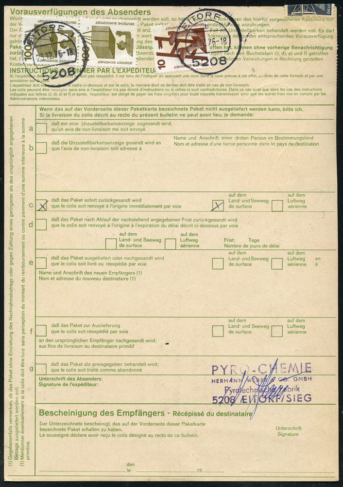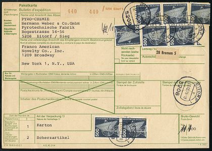 9731 | 18 € | PL-Raum 52 : 5208 EITORF 1/ b 1976 (23.12.) 1K-Segment mehrfach auf 8x 500 Pf Technik Radioteleskop (1x "um die Ecke geklebt") u.a.Frankatur Unfall rs., + brauner Paketzettel: 5208 Eitorf 1 (Abs. Pyro-Chemie Herm. Weber) Übersee-Paketkarte n. USA, seltene Portostufe über 40.- DM ! (Mi.859 8x wie MeF, u.a. rs.) | ![]() ![]() | |