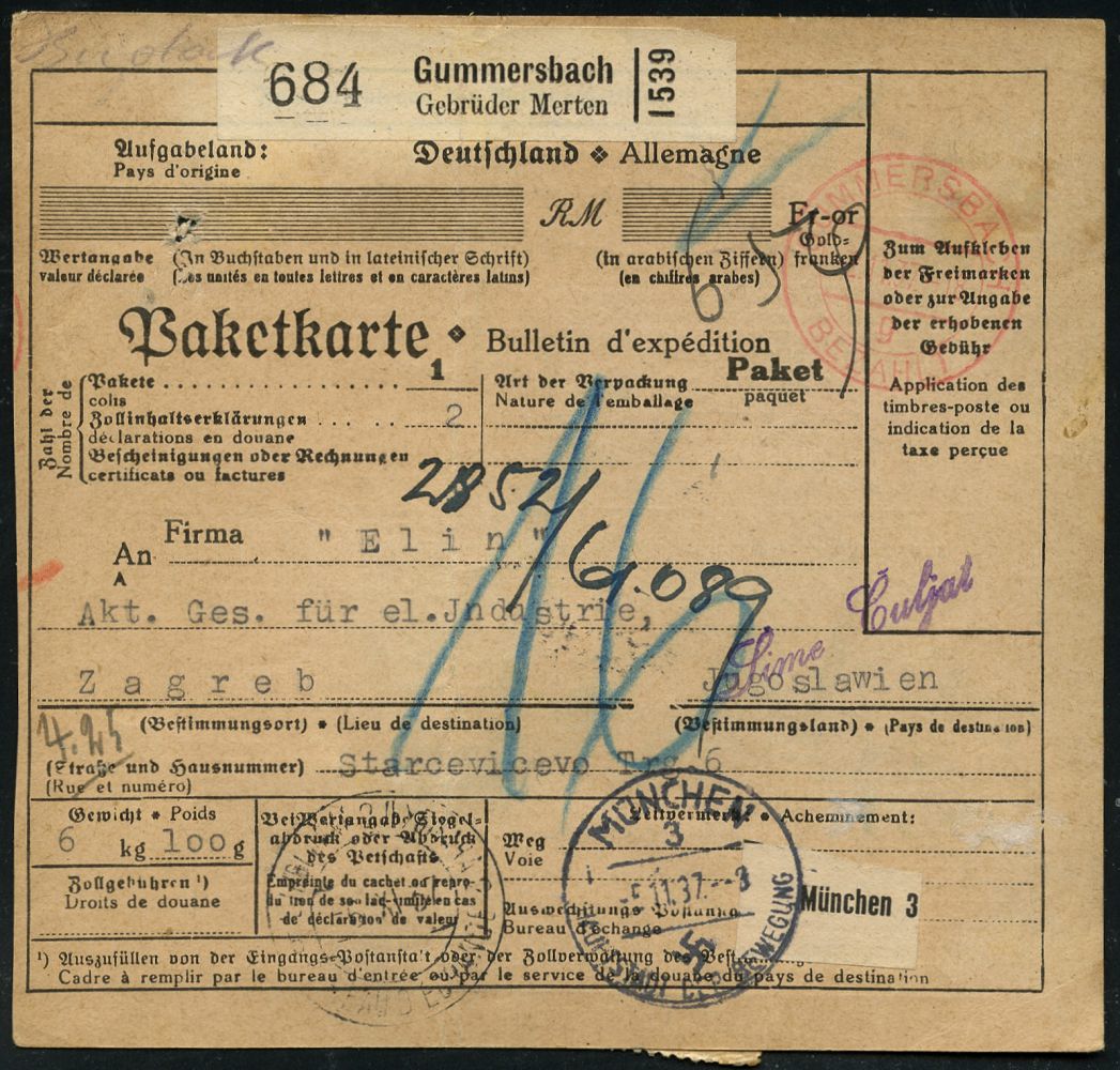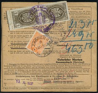 9735 | 18 € | PL-Raum 52 : GUMMERSBACH/ g/ BEZHALT 1937 (2.11) roter 2K-Steg PFS mit Uhrzeit + schw. Selbstbucher-Paketzettel: Gummersbach/ Gebrüder Merten + Leizettel: München 3, Ausl.-Selbstbucher-Paketkarte (schwache Mittelfalte u. kl. Kerbe) n. Zagreb, rs. jugoslaw. Fiskal- u. Taxmarken (Dü.A-7 Nr.32) | ![]() ![]() | |