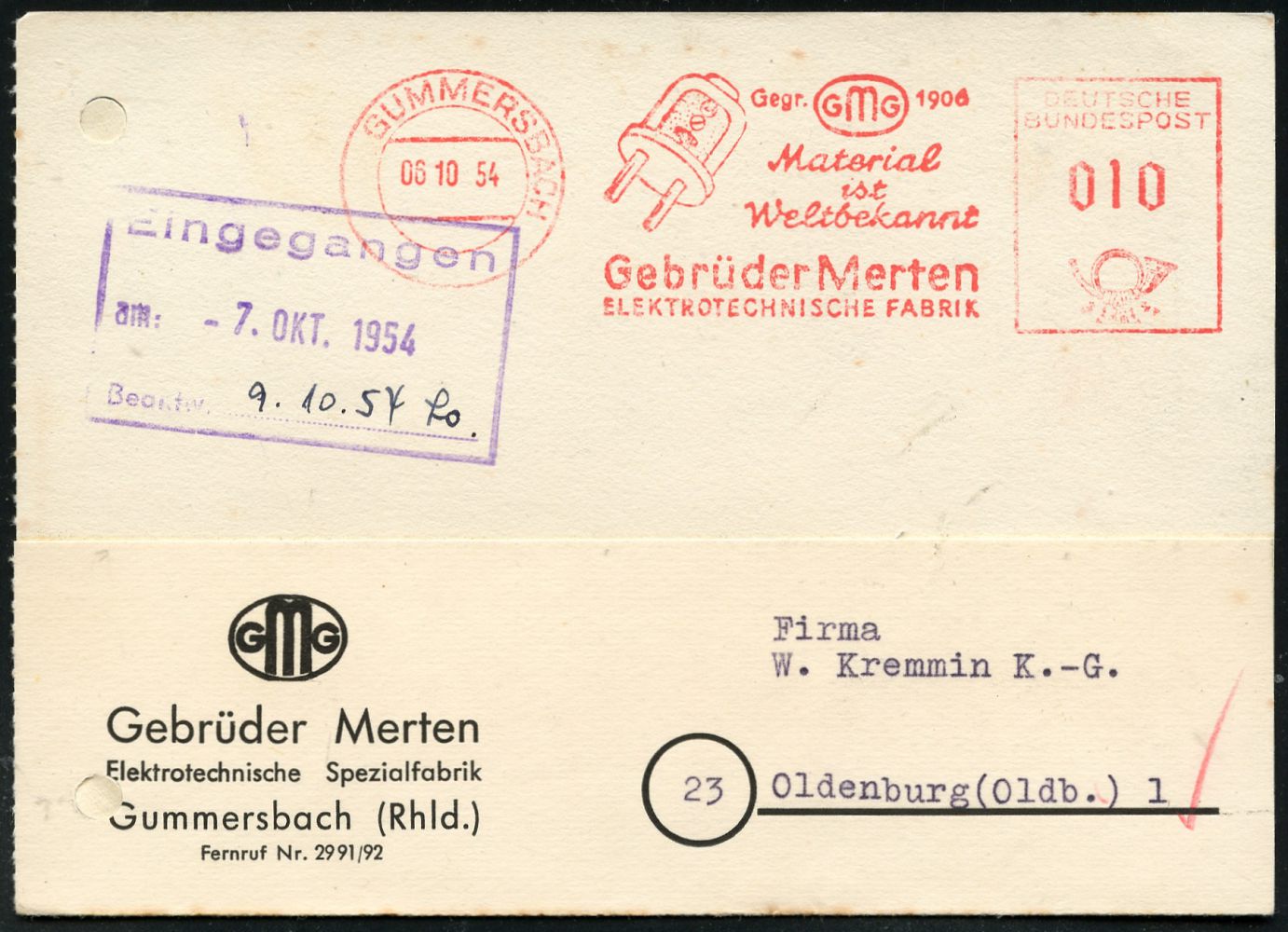 9738 | 12 € | PL-Raum 52 : GUMMERSBACH/ Gegr. GMG 1906/ ..Gebr.Merten/ ELEKTROTECHN.FABRIK 1954 (6.10.) AFS Francotyp (Elektrostecker) Firmen-Kt. (Reg.-Lochung geschl.) mit Firmen-Monogr. (Dü.E-23CG, alte PLGZ entfernt) | ![]() | |