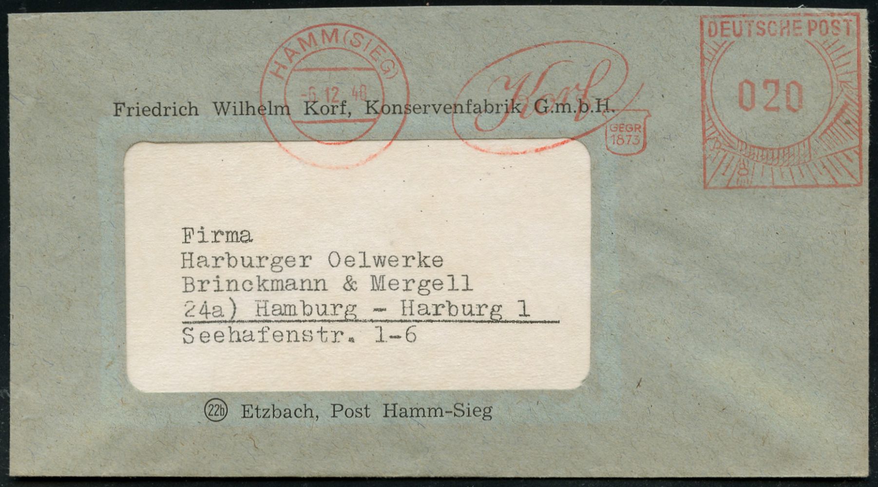 9747 | 20 € | PL-Raum 52 : HAMM (SIEG)/ Korf/ GEGR.1873 1948 (6.12.) AFS Francotyp "Gr. Posthorn" Französ. Zone! , Firmen-Bf.: Friedr. Wilh. Korf, Konservenfabrik GmbH, (22 b) Etzbach (Dü.E-22CGo) | ![]() | |
