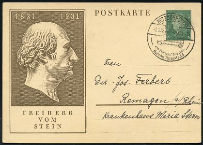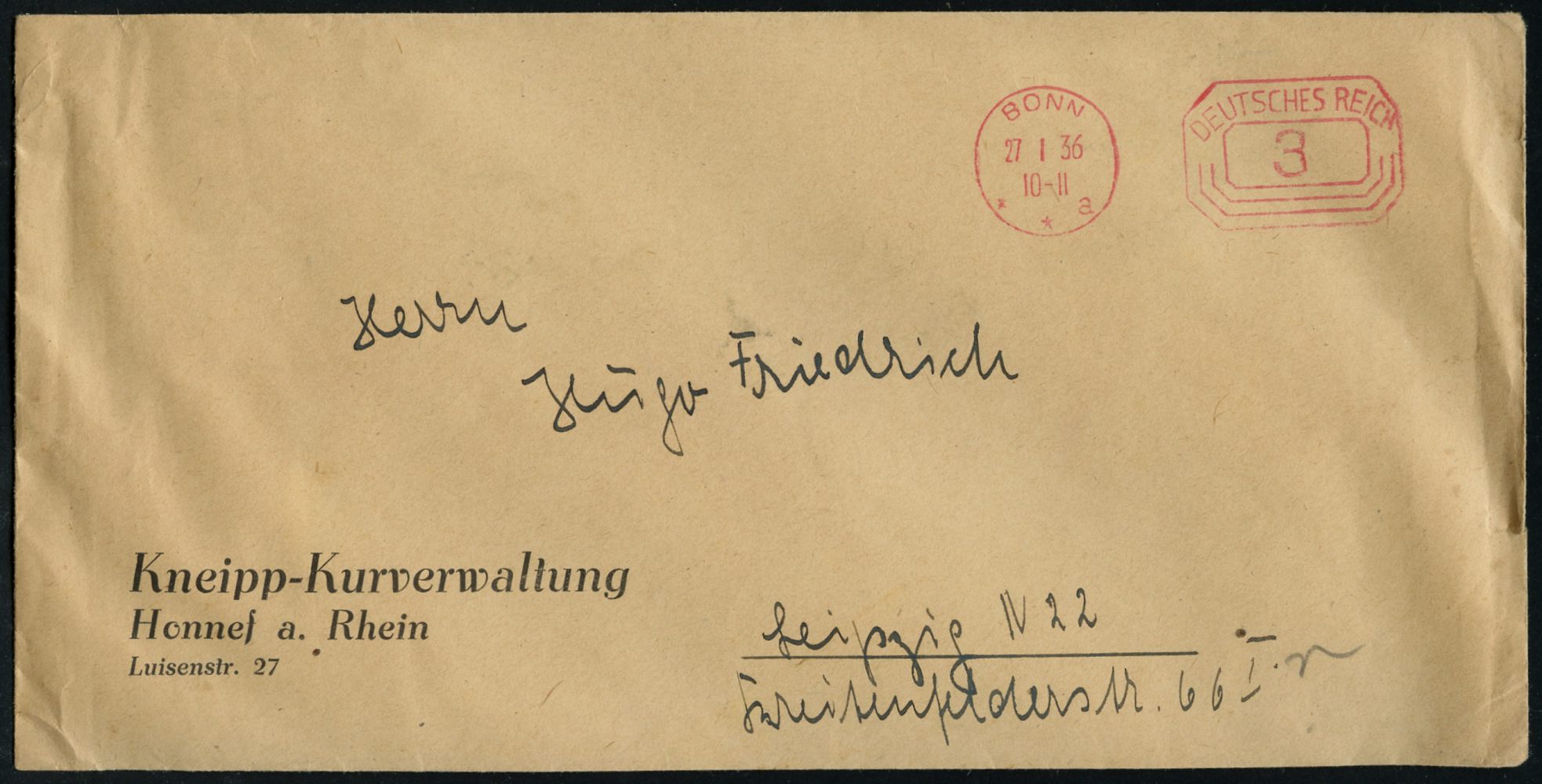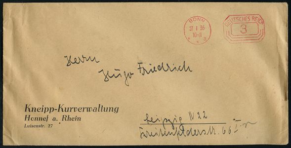 9751 | 12 € | PL-Raum 52 : Honnef a. Rhein 1936 (27.1.) Dienst-Bf.: Kneipp-Kurverwaltung Honnef a. Rhein, , Post-FS: BONN/* * a n. Leipzig (Dü.D-4) | ![]() | |