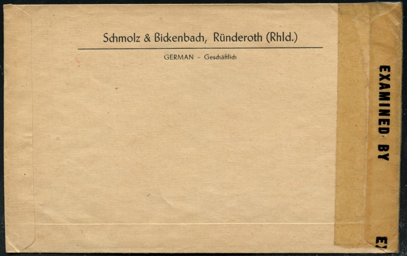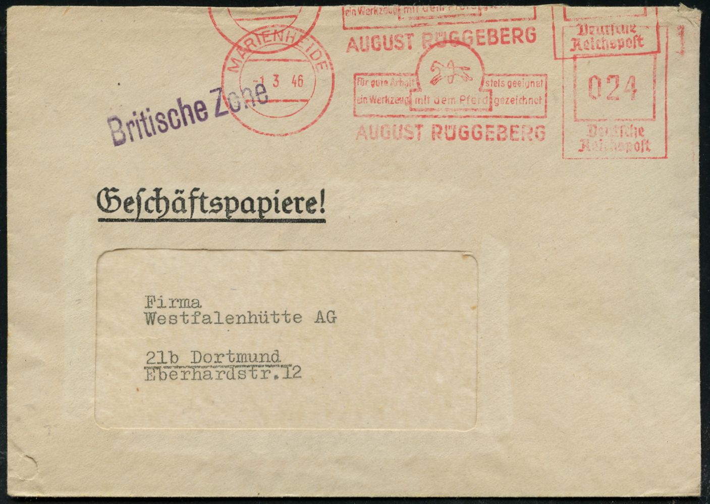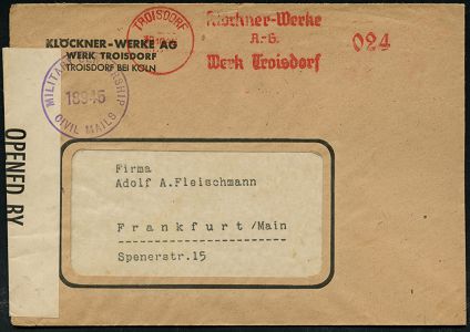 9776 | 30 € | PL-Raum 52 : TROISDORF/ Klöckner-Werke/ A.-G./ Werk Troisdorf 1946 (30.10.) total aptierter AFS Francotyp "Reichsadler", Wertrahmen komplett entfernt, nur Wertziffern = Notmaßnahme! + brit. Zensurstreifen; OPENED BY/MIL. CEN.-CIVIL MAILS (PSS.2411) + viol. Zensur-1K: MILITARY CENSORSHIP/ 18945/ CIVIL MAILS = Bonn (Rie.B-5, A-100 + 50 Pkte.), Inl.-Zensur-Bf. (Dü.E-16-237o) | ![]() ![]() | |