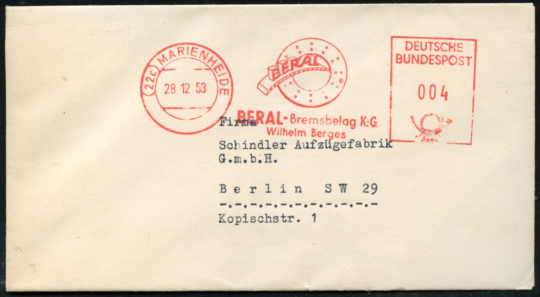 9758 | 16 € | PL-Raum 52 : (22c) MARIENHEIDE/ BERAL-Bremsbelag KG/ Wilhelm Berges 1953 (28.12.) AFS Postalia (Bremsscheibe) kleiner Firmen-Bf. n. West-Berlin (Dü.E.23B) | ![]() ![]() | |