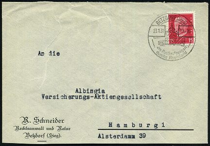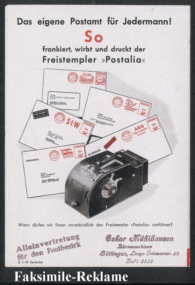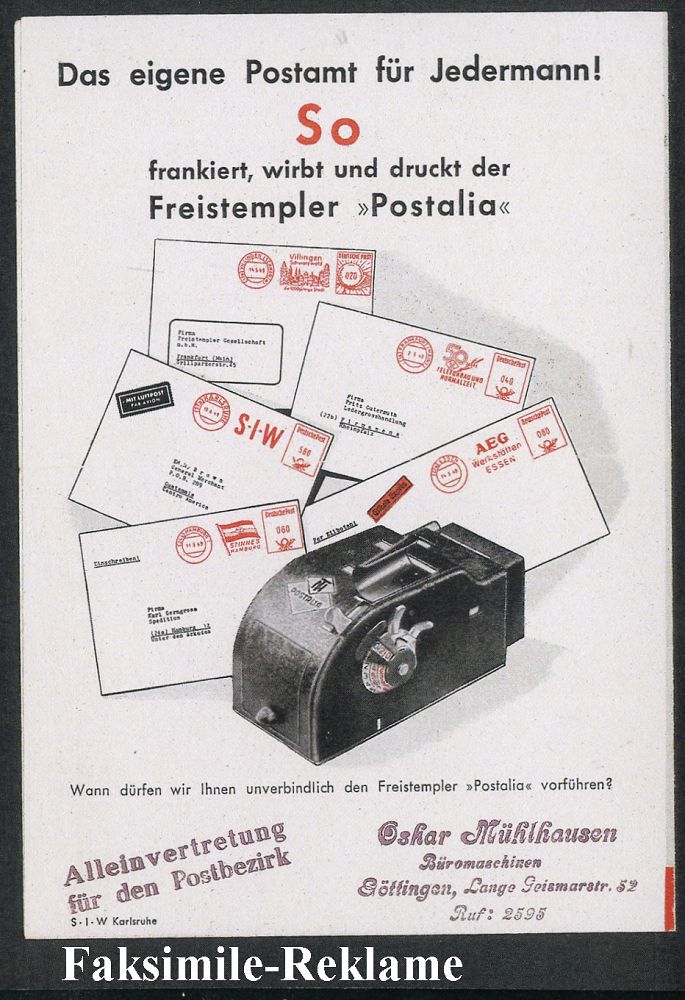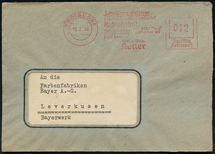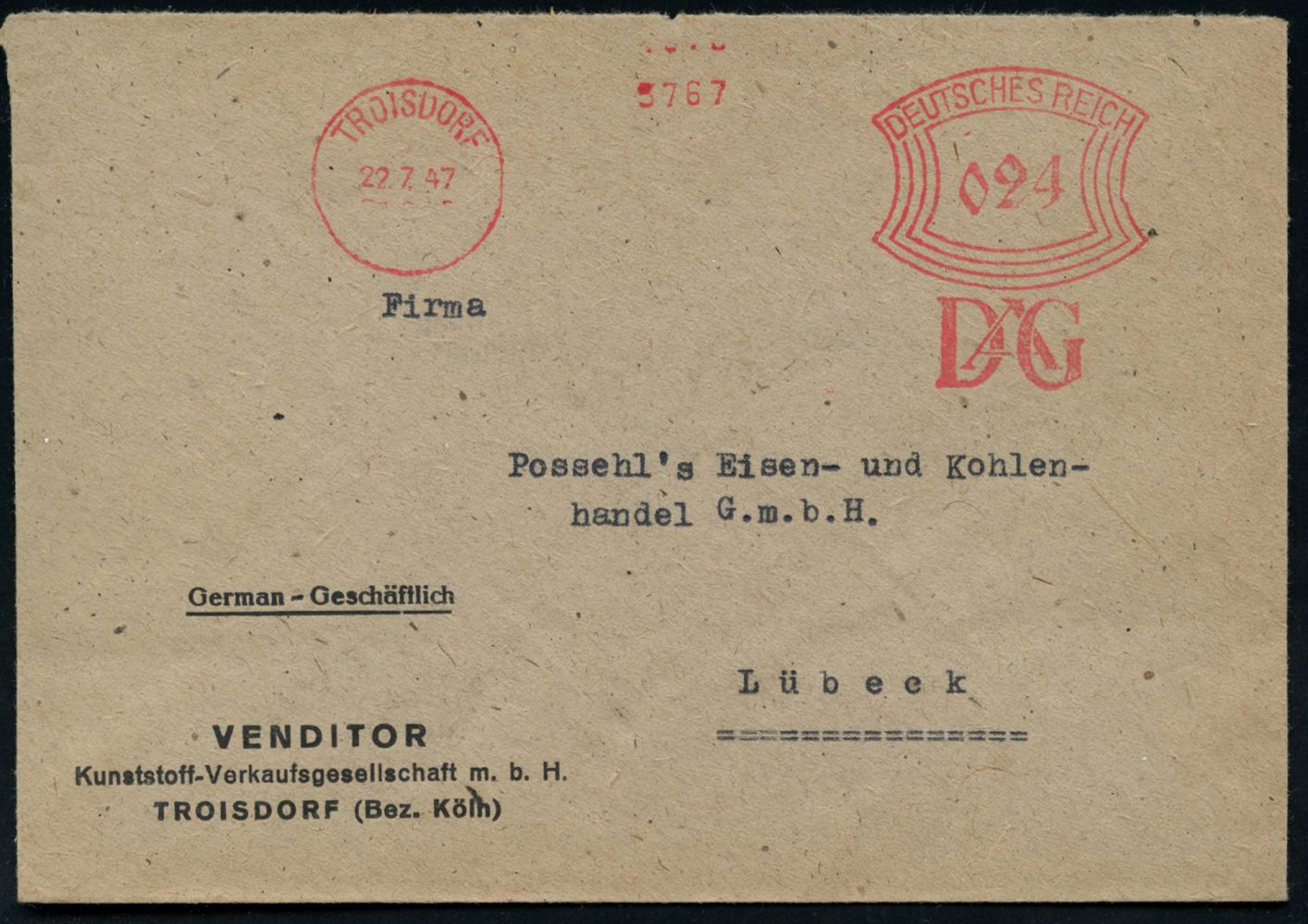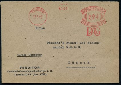 9777 | 25 € | PL-Raum 52 : TROISDORF/ D A G 1947 (22.7.) AFS Francotyp "Bogenrechteck" mit Inschrift "DEUTSCHES REICH" unverändert weiterverwendet = Notmaßnahme! = Dynamit-Nobel A.G. auf Firmen-Bf.: VENDITOR, Kunststoff-Verkaufs-GmbH, seltener Beleg! (Dü.E-1BAh, unverändert!) | ![]() | |