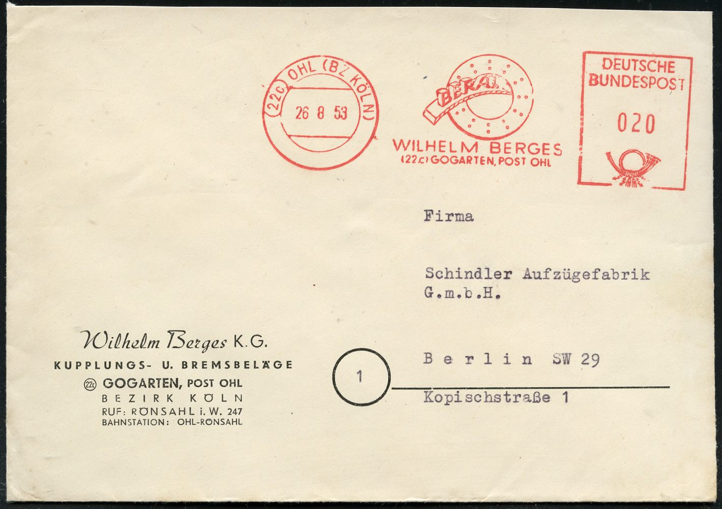 9764 | 16 € | PL-Raum 52 : (22c) OHL (BZ KÖLN)/ BERAL/ WILHEM BERGES/ (22 c) GOGARTEN POST OHL 1953 (26.8.) AFS Postalia (Bremsscheibe) auf Firmen-Bf.: Wilhelm Berges K.G., KUPPLUNGS- U. BREMSBELÄGE.. (rs. Landkarte) n. West-Berlin vergl. Kat.-Nr. 9758 (Dü.E-23B) | ![]() ![]() ![]() | |