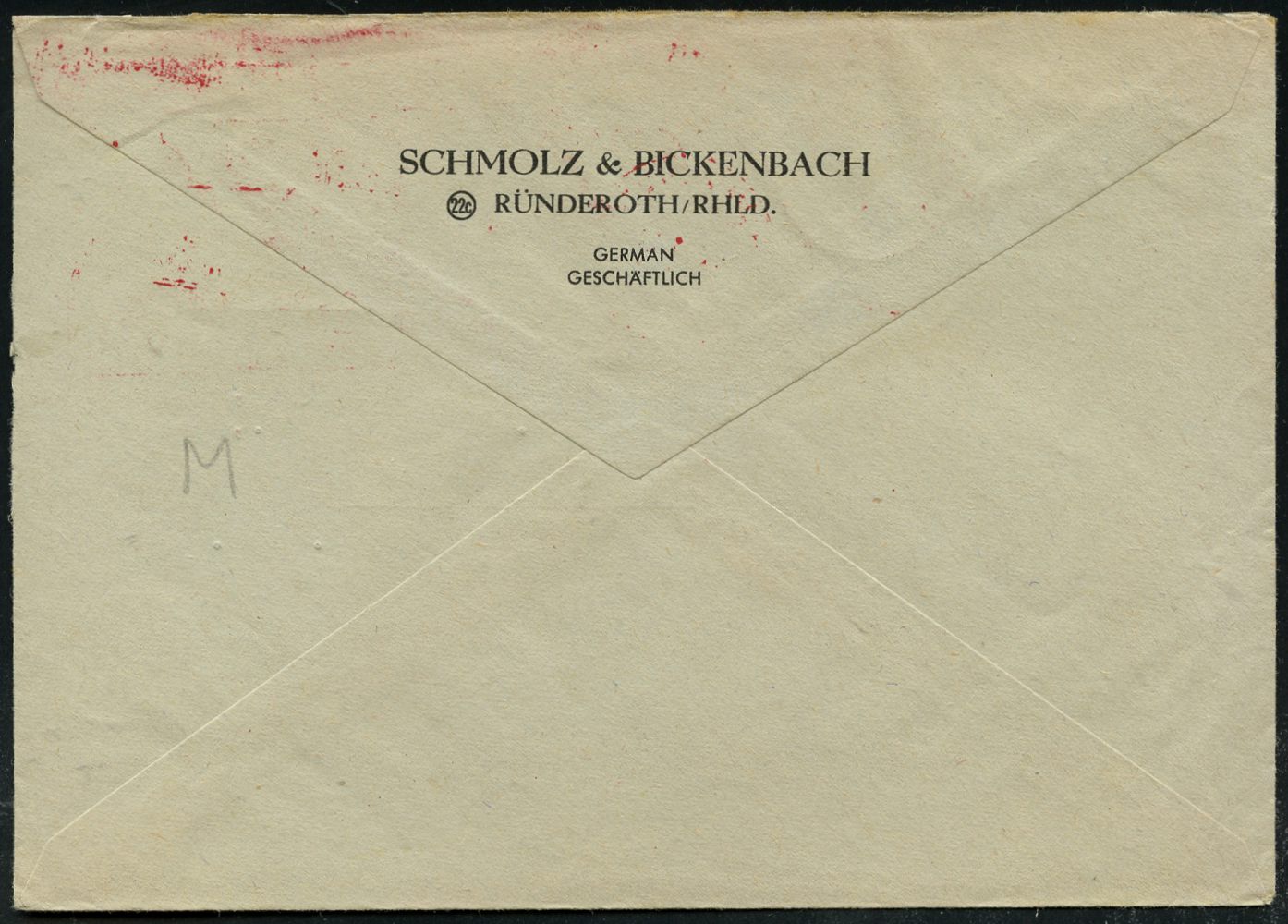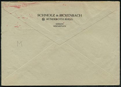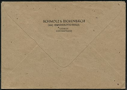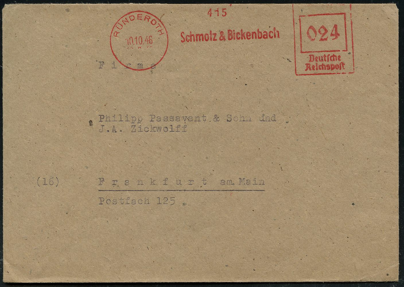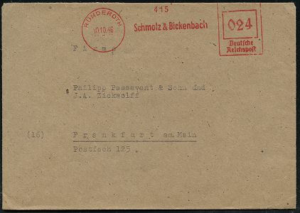 9770 | 20 € | PL-Raum 52 : RÜNDEROTH/ Schmolz & Bickenbach 1946 (10.10.) aptierter AFS Francotyp "Reichsadler" = entfernt = Notmaßnahme! , rs. Abs.-Vordruck, Fern-Bf. (Dü.E-13 J-122h) | ![]() ![]() | |