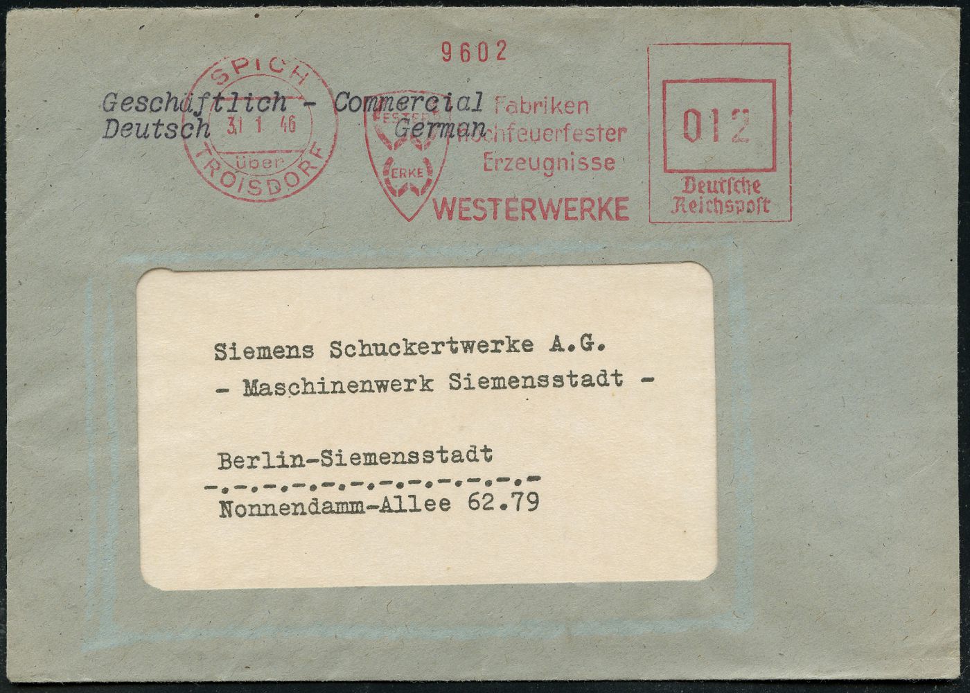 9773 | 25 € | PL-Raum 52 : SPICH/ über/ TROISDORF/ WW/ Fabriken/ hochfeuerfester/ Erzeugniss/ WESTERWERKE 1946 (31.1.) aptierter AFS Francotyp "Reichsadler" = entfernt = Notmaßnahme! (Monogr.-Logo) klar gest. Fern-Bf. (Dü.E-13 J-129h = Pst. I-Typ) | ![]() | |