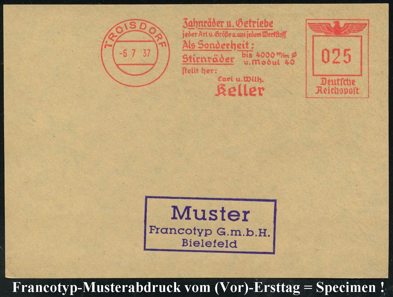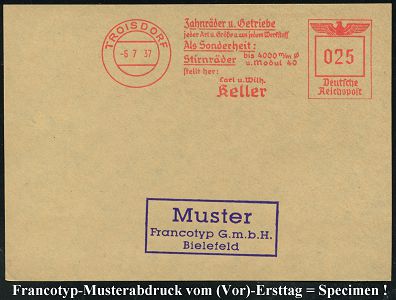 9774 | 35 € | PL-Raum 52 : TROISDORF/ Zahnräder u.Getriebe../ Als Sonderheit:(Stirnräder../ Carl u.Wilh./ Keller 1937 (6.7.) AFS-Musterabdruck Francotyp "Reichsadler" , glasklar gest. Francotyp-Musterblatt vom (Vor)-Ersttag !, selten!, vergl. Kat.-Nr. 9775 (Dü.E-5CGh) | ![]() ![]() | |