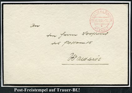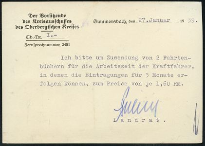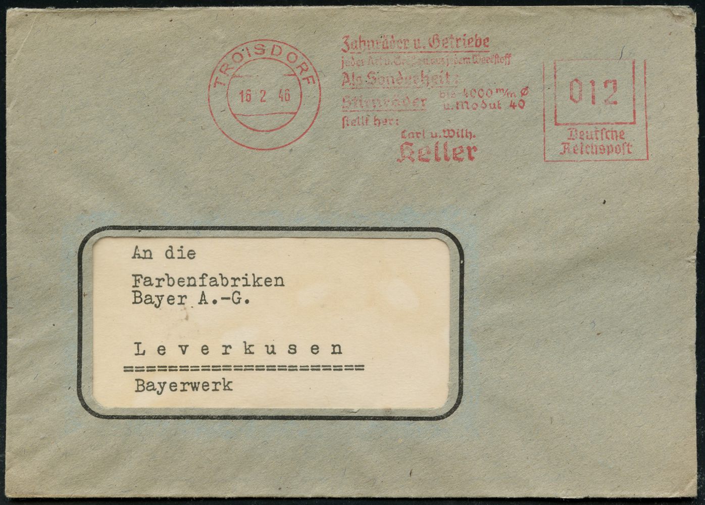 9775 | 25 € | PL-Raum 52 : TROISDORF/ Zahnräder u.Getriebe../ Als Sonderheit:/ Stirnräder../ Carl u.Wilh./ Keller 1946 (16.2.) aptierter AFS Francotyp "Reichsadler" = entfernt = Notmaßnahme! , Fern-Bf., vergl. Kat.-Nr. 9774 (Dü.E-13 J-129o) | ![]() | |