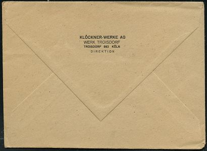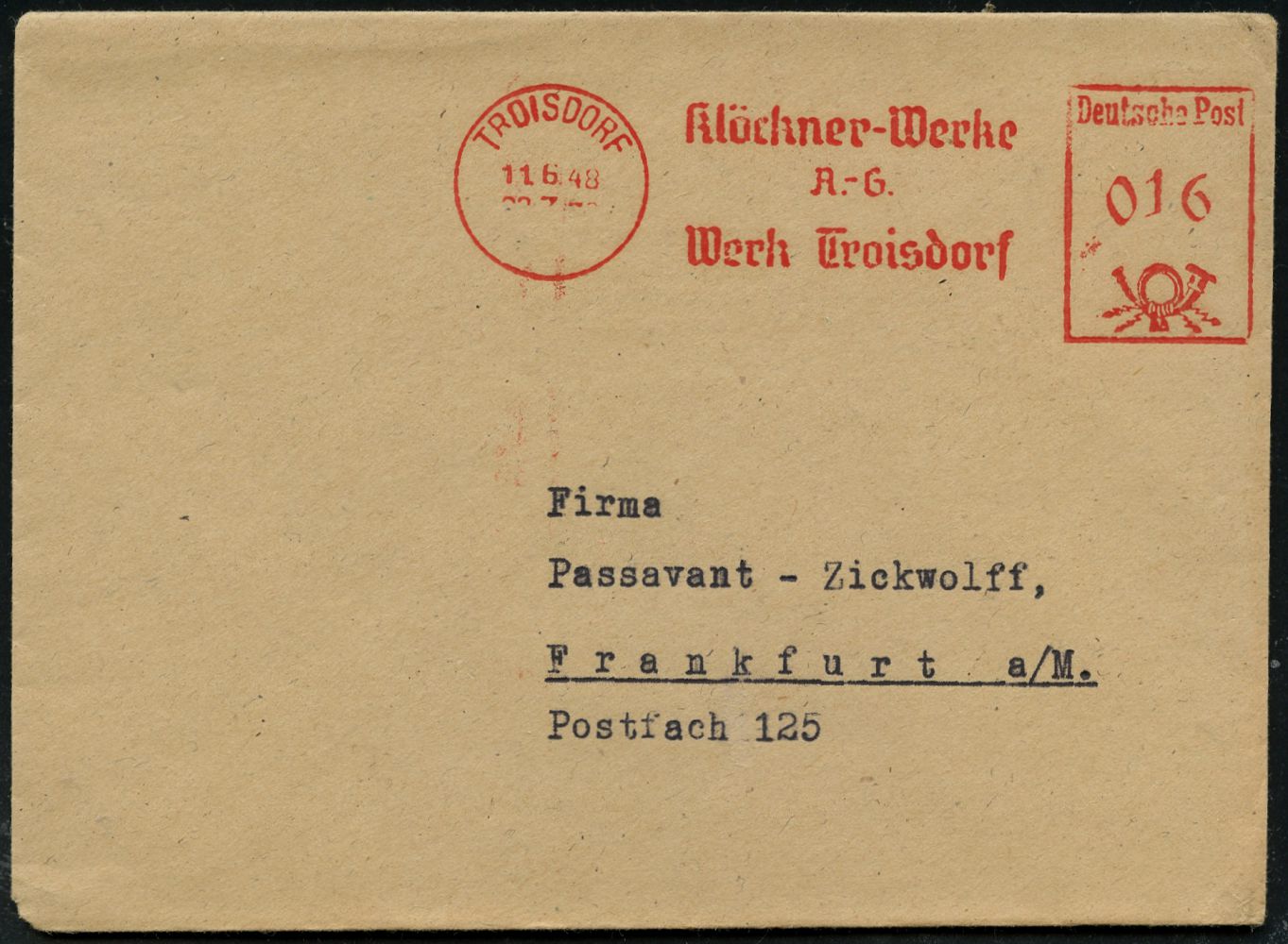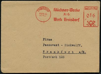 9778 | 18 € | PL-Raum 52 : TROISDORF/ Klöckner-Werke/ A.-G./ Werk Troisdorf 1948 (11.6.) AFS Francotyp "Posthorn" , rs. Abs.-Vordruck, Fern-Bf. (Dü.E-20BAo) | ![]() ![]() | |