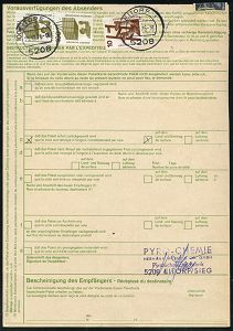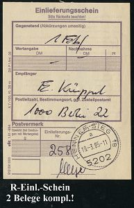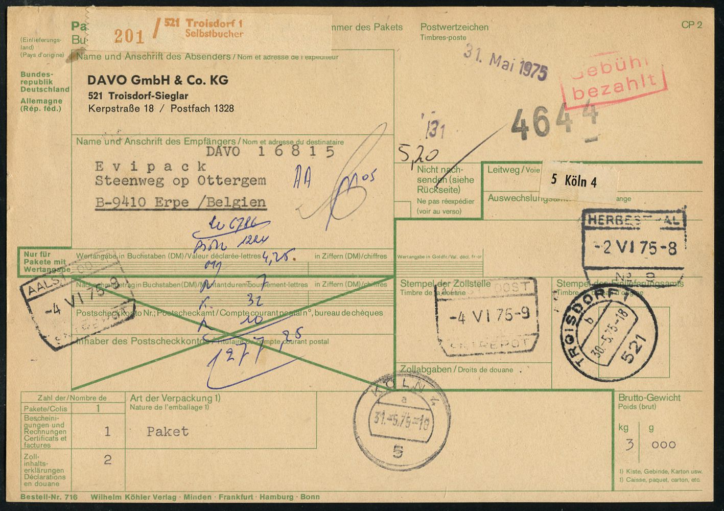 9779 | 18 € | PL-Raum 52 : 521 TROISDORF 1/ b 1975 (30.5.) 1K-Segment + roter Ra.2: Gebühr/bezahlt + brauner Paketzettel: 521 Troisdorf 1/ Selbstbucher + Leitzettel u. 1K-Segment: 5 KÖLN 4, Ausl.-Selbstbucher-Paketkarte (= Fa. DAVO GmbJ) n. Belgien, vs. AS. | ![]() | |