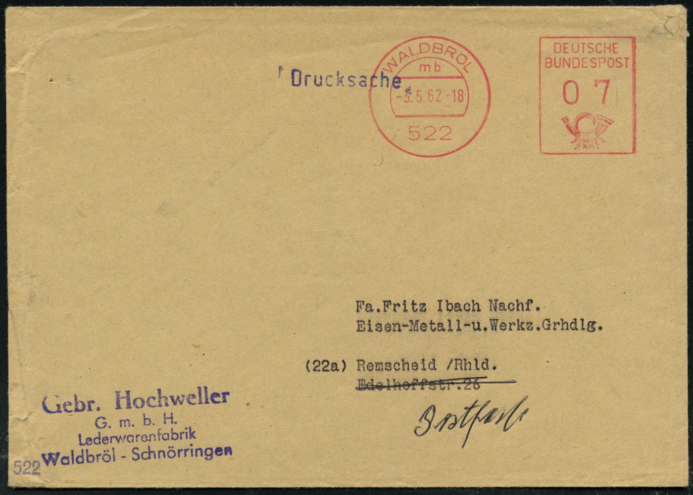 9782 | 10 € | PL-Raum 52 : 522 WALDBRÖL/ mb/ DEUTSCHE/ BUNDESPOST 1962 (3.5.) PFS "Posthorn" mit neuer PLZ u. Uhrzeit , Abs.-4L: Gebr. Hochweller.. Lederwarenfabrik.., Inl.-Drs.-Bf. (Dü.D-17) | ![]() | |