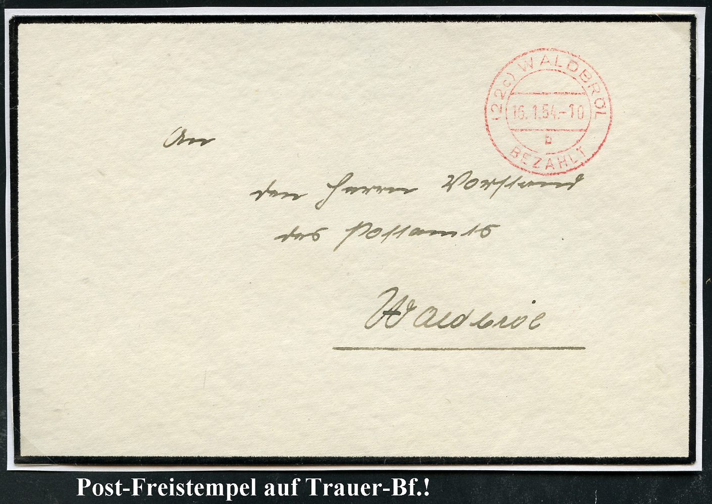 9783 | 16 € | PL-Raum 52 : (22c) WALDBRÖL/ b/ BEZAHLT 1954 (16.1.) Hand-2K-Steg-PFS mit Uhrzeit auf Trauer-Bf., seltene Verwendun! (Dü.A-7, Nr.32) | ![]() | |