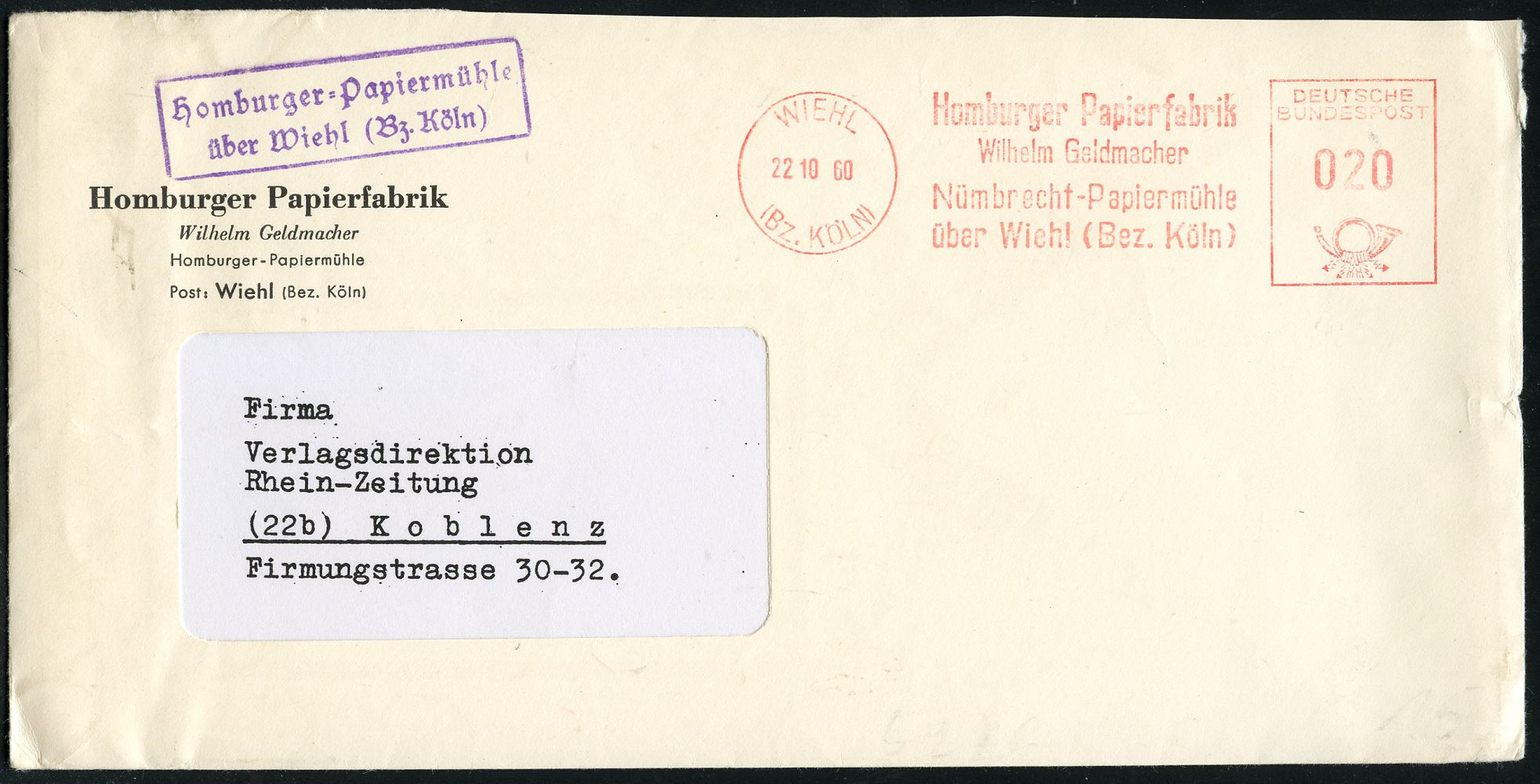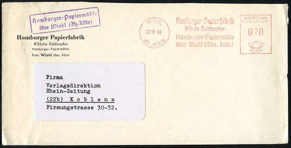 9786 | 16 € | PL-Raum 52 : WIEHL/ (Bz.KÖLN)/ Homburger Papierfabrik/ Wilhelm Geldmacher/ Nümbrecht-Papiermühle.. 1960 (22.10.) AFS Francotyp + viol. Ra.2: Homburger=Papiermühle/ über Wiehl (Bz. Köln) = Hauspostamt PSt. II , Firmen-Bf. (rechts kl. Riß) klar gest. ! (Dü.E-23CO) | ![]() | |