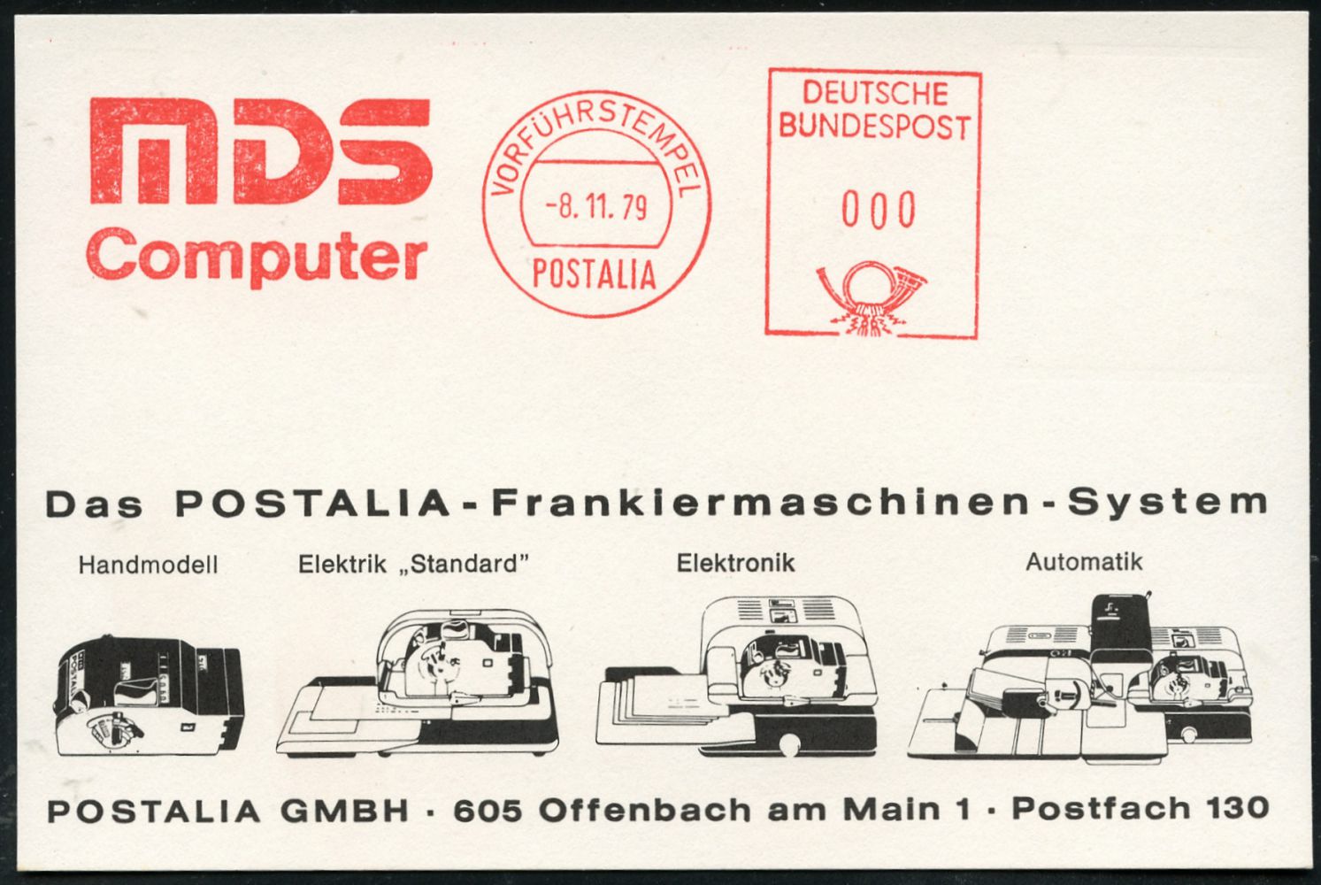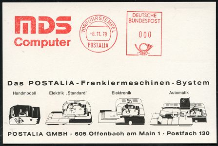 9788 | 18 € | PL-Raum 52 : Windhagen 1979 (8.11.) AFS.: VORFÜHRSTEMPEL/POSTALIA/M D S/Computer = Fa. Medical D(ata) S(ervices) , seltene Postalia-Musterkarte (= Specimen) | ![]() | |