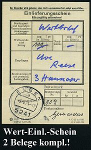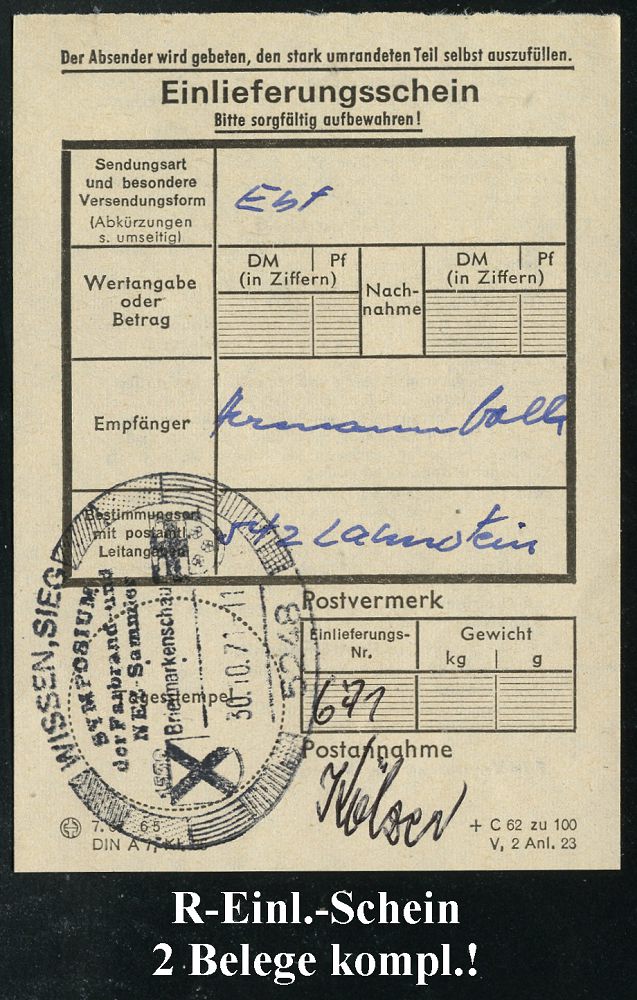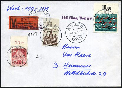 9732 | 20 € | PL-Raum 52 : 5241 ELBEN 1971 (9.6.) 1K-Segment + provis. orange V-Zettel: 5906 Nieder-/schelden, gestrichen u. überstempelt, 1L: 5241 Elben Westerwald (schaltergestempelt!) Inl.-Wert-Bf. 100.- DM, + Wert-Einl.-Schein, 2 Belege kompl. (n. Hannover, rs. AS) | ![]() ![]() | |