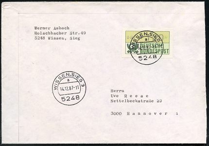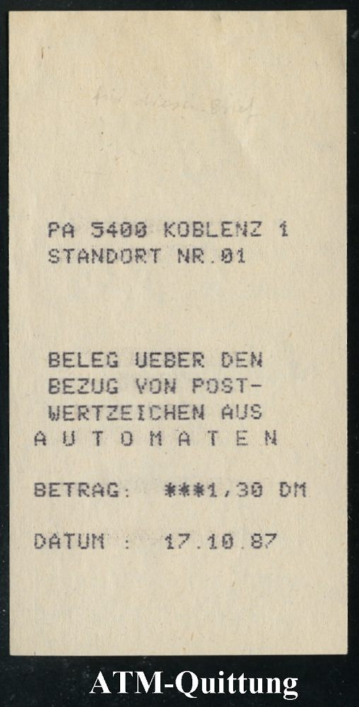 9797 | 15 € | PL-Raum 52 : 5248 WISSEN,SIEG 3/ a 1987 (14.12.) 1K-Segment auf EF 1.30 Pf. ATM + Quittung vom PA 5400 Koblenz (Automaten-Quittung) Fern-Bf., 2 Belege kompl. (Mi.1 EF 130 Pf.) | ![]() ![]() | |