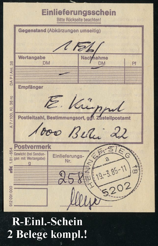 9750 | 18 € | PL-Raum 52 : 5202 HENNEF,SIEG 18/ a 1981 (13.3.) 1K-Segment + provis. RZ: 5202 Hennef 18 (viol. 1L auf Blanco-RZ) = PSt.II Bödingen, klar gest. Inl.-R-Bf. + R-Einl.-Schein, 2 Belege kompl.! | ![]() ![]() | |