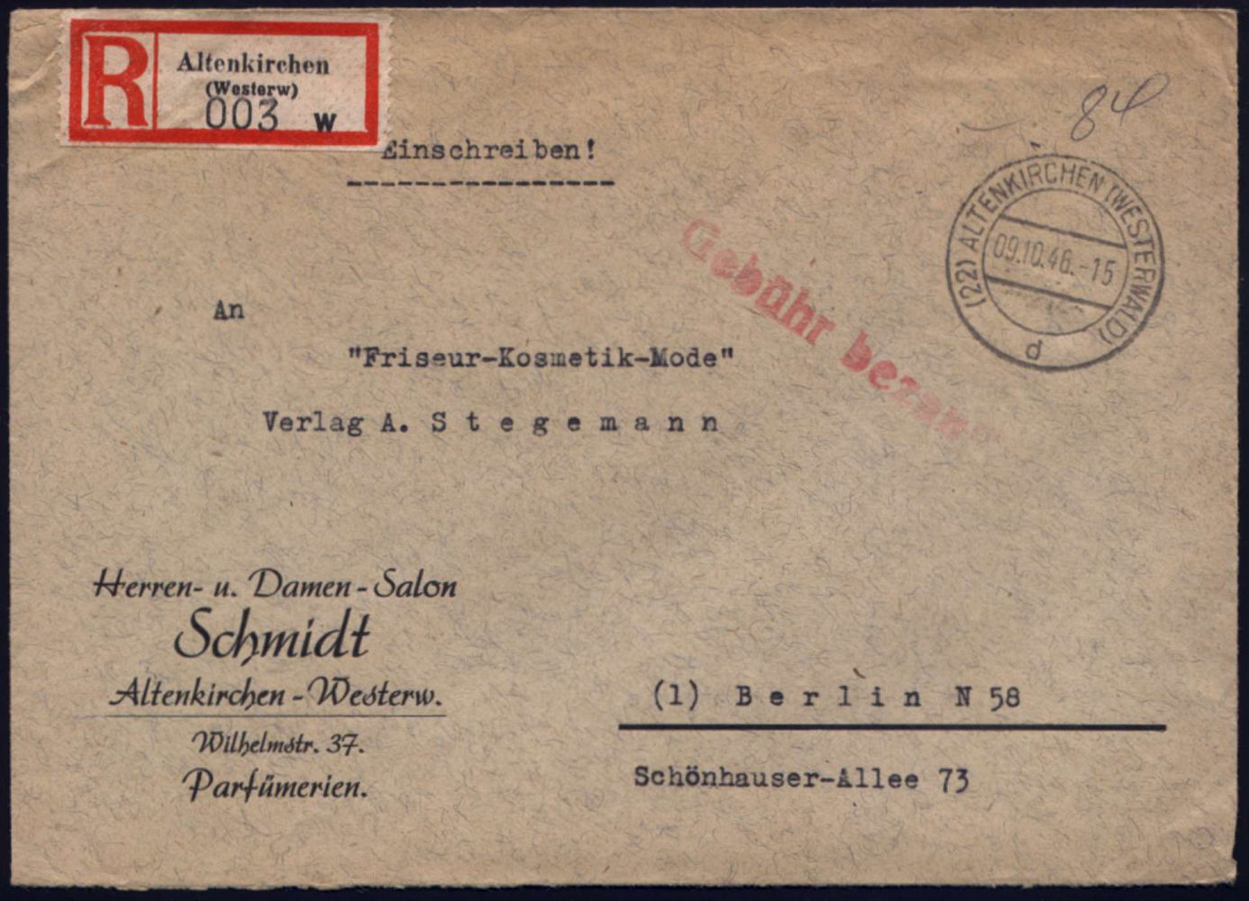 9713 | 18 € | PL-Raum 52 : (22) ALTENKIRCHEN (WESTERWALD)/ d 1948 (9.10.) 2K-Steg + roter 1L: Gebühr bezahlt + RZ: Altenkirchen/(Westerw)/w , klar gest. Firmen-Bf.: Herren- u. Damen-Salon, Schmidt.., klar gest. Inl.-R-Bf. (n. Ost-Berlin) | ![]() | |