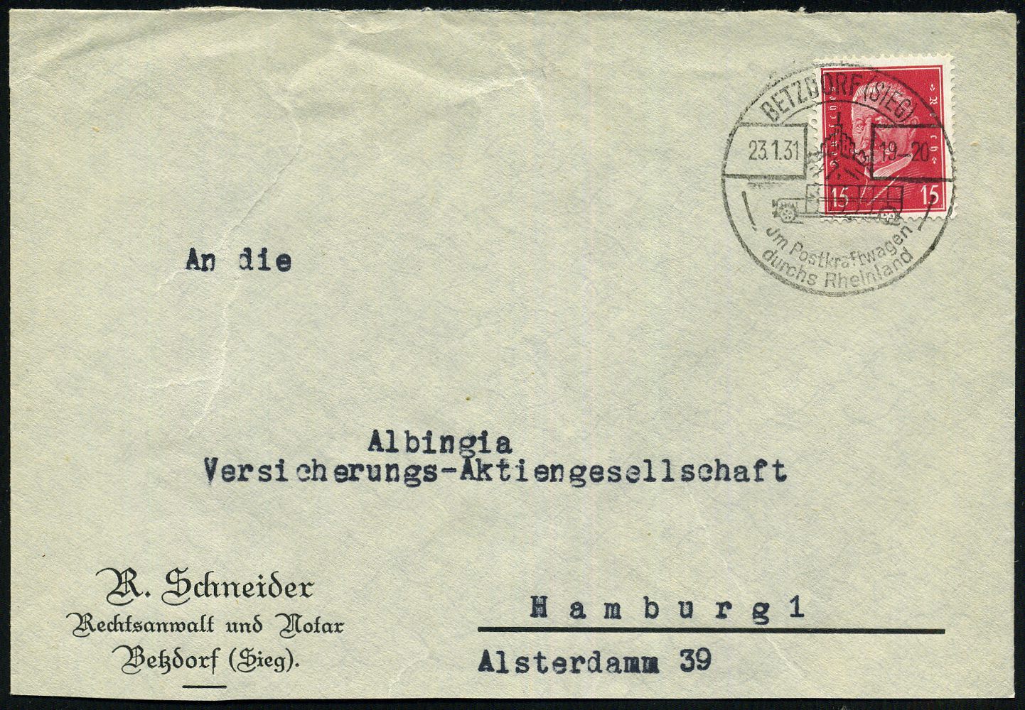 9715 | 12 € | PL-Raum 52 : BETZDORF (SIEG)/ Jm Postkraftwagen/ durchs Rheinland 1931 (23.1.) HWSt = Omnibus (vor Burg) klar gest. (etw. verkürzter) Inl.-Bedarfs-Bf. (Bo.1) | ![]() | |
