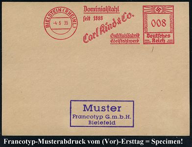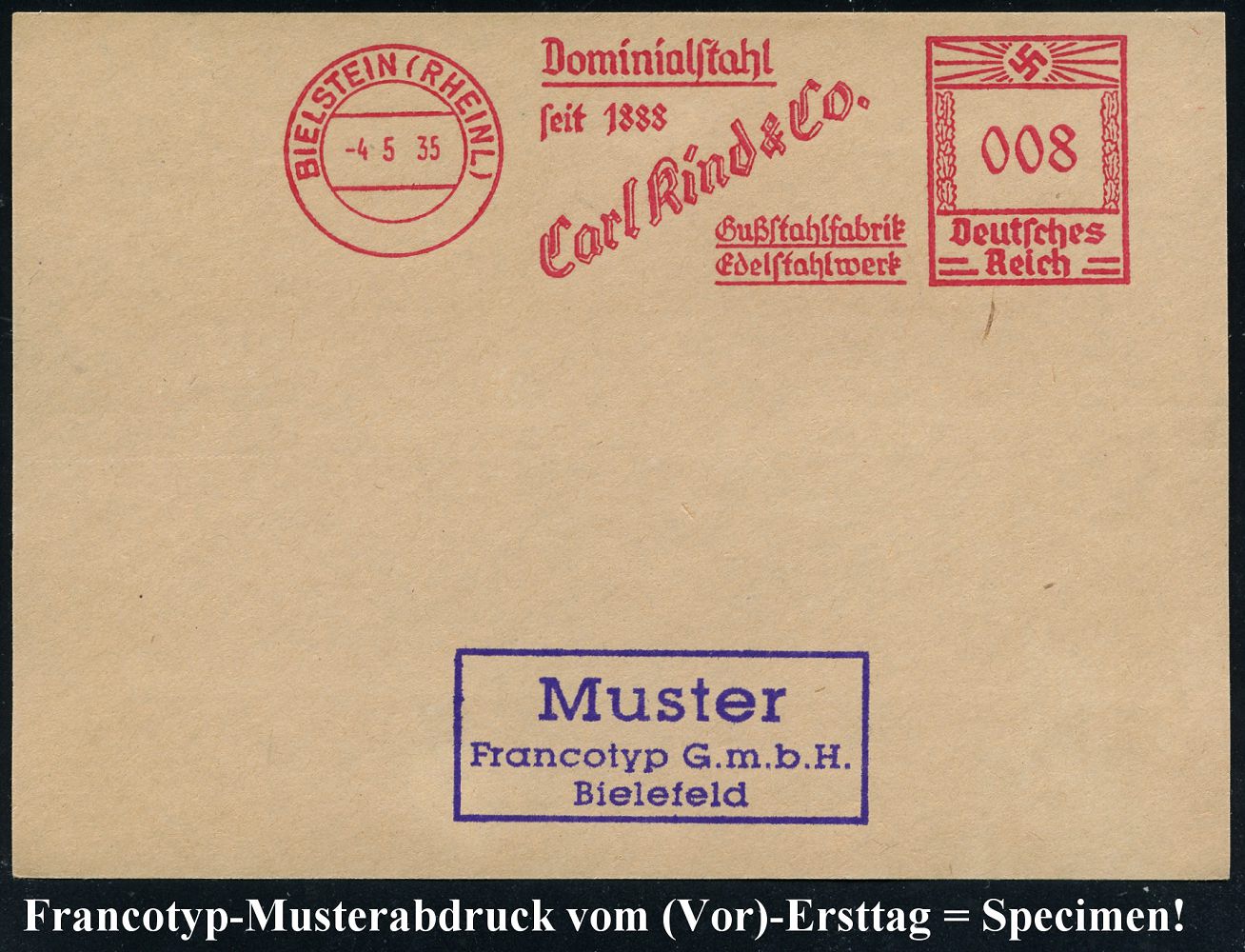 9722 | 35 € | PL-Raum 52 : BIELSTEIN (RHEINL)/ Dominialstahl/ seit 1888/ Carl Kind & Co./ Gußstahlfabrik/ Edelstahlwerk 1935 (4.5.) AFS-Musterabdruck Francotyp "Hakenkreuz" glasklar auf Francotyp-Musterblatt vom (Vor)-Ersttag!, selten! (Dü.E-3CEo) | ![]() ![]() | |