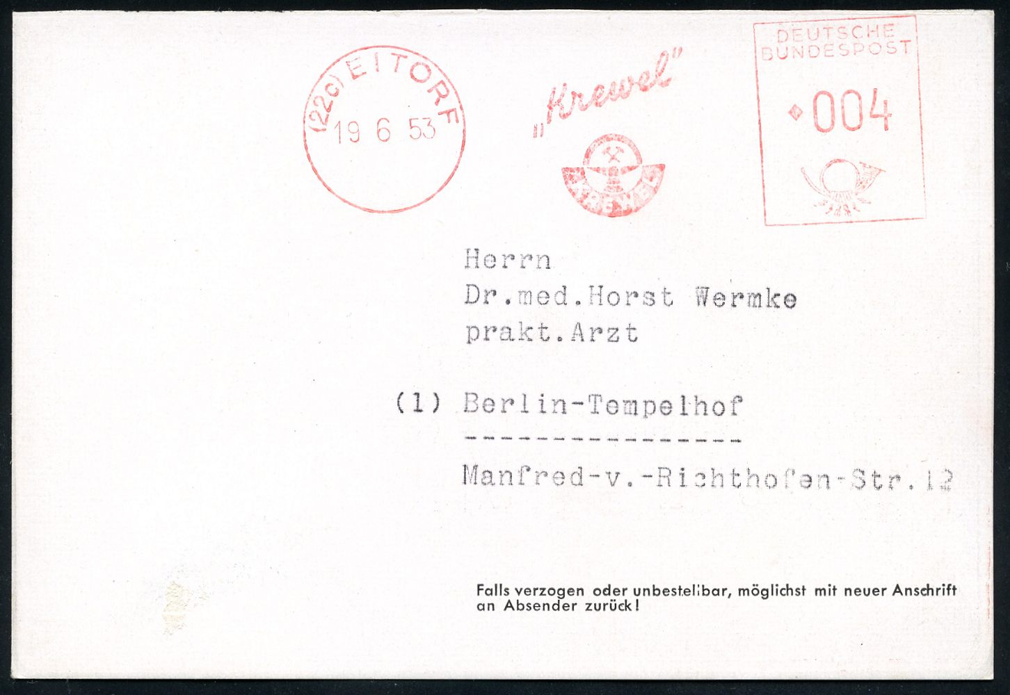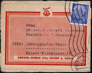 9729 | 20 € | PL-Raum 52 : Eitorf 1957 (4.1.) Roll-WellenSt (Ort nicht abgeschlagen) auf EF 15 Pf. Heuss I , Firmen-Label: KREWEL-WERKE (22c ) EITORF b. KÖLN (Firmenlogo Pharma-Firma) auf Warensendungs-Fragment, selten, da meist nicht erhalten! (Mi.184 EF + 25.- EUR) | ![]() | |