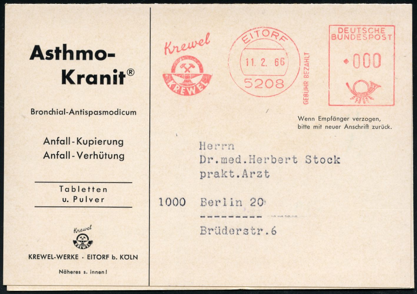 9730 | 16 € | PL-Raum 52 : 5208 EITORF/ GEBÜHR BEZAHLT/ Krewel.. 1966 (11.2.) AFS Francotyp in 000 + GEBÜHR BEZAHLT = Massn-Drs.! (vorschriftsmäßig), Reklame-Klapp-Kt.: Asthmo-Kranit.. mit ungebr. Antwort-Kt. kompl. (Dü.E-26) | ![]() ![]() | |