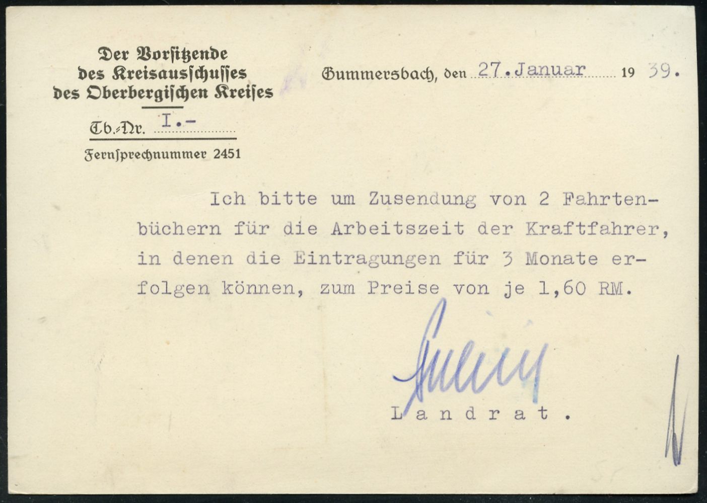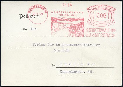 9736 | 20 € | PL-Raum 52 : GUMMERSBACH/ AGGERTALSPERRE/ 20,5 mill. cbm./ KREISVERWALTUNG 1939 (28.1.) dekorativer AFS Francotyp "Bogenrechteck" = Agger-Talsperre , klar gest. Kommunal-Kt.:Der Vorsitzende des Kreisausschusses.. mit Signatur des Landrates, sehr ausdrucksvolles Motiv! (Dü.E-1CEh) | ![]() ![]() | |