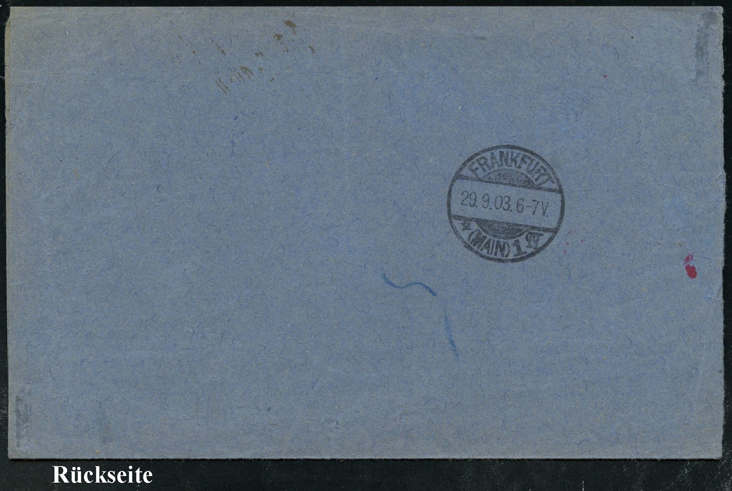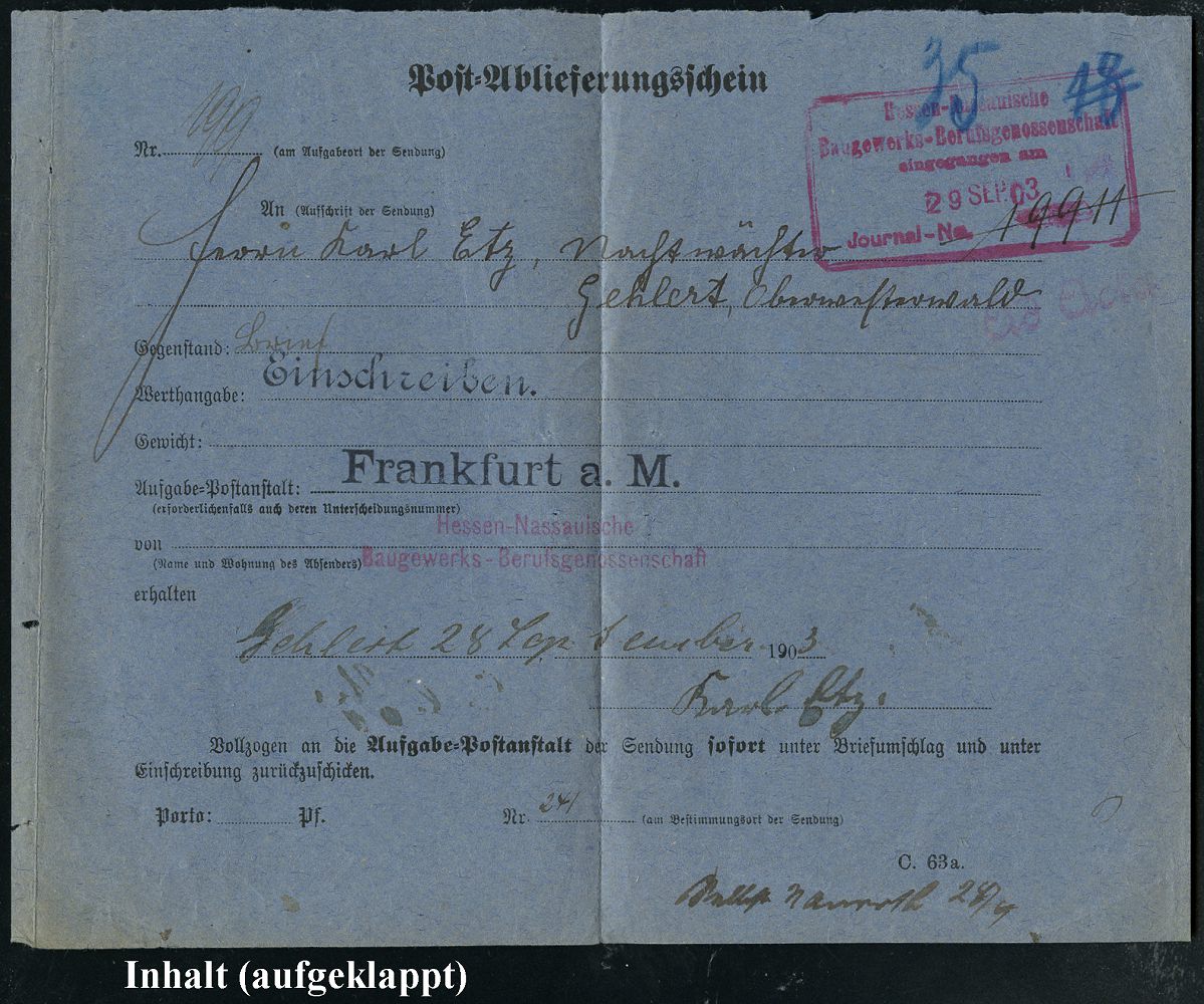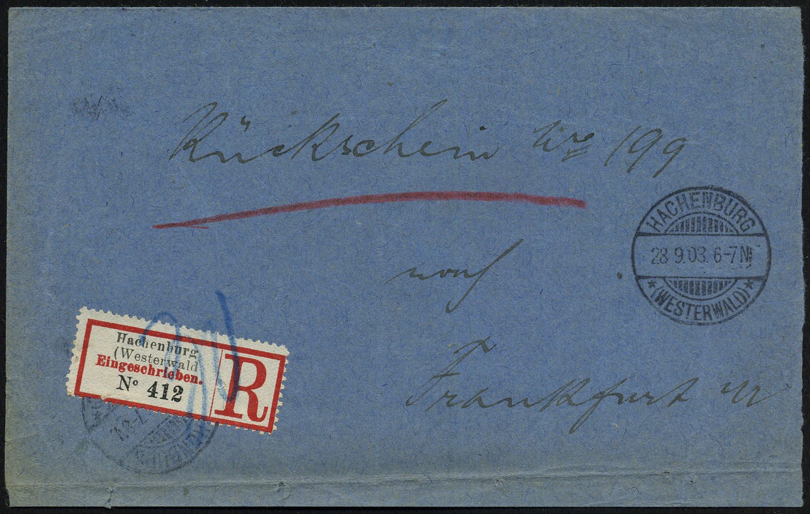 9740 | 25 € | PL-Raum 52 : HACHENBURG/ *(WESTERWALD)* 1903 (28.9.) 1K-Gitter + gez. RZ: Hachenburg/(Westerwald) ("R" rechts) auf blauem Rückschein "Post-Ablieferungsschein" (Form C 63a.) als Einschreiben n. Frankfurt/M. zurück! | ![]() ![]() ![]() | |
